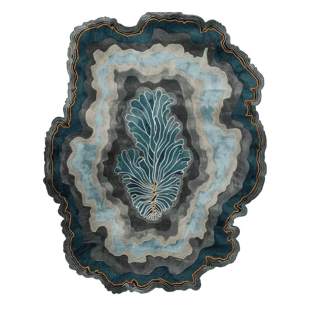 The Starlit Quarry Hand Tufted Rug has rings of teal, gray, and soft beige that spread from a striking botanical core. These rings capture the stunning beauty of geode shapes. The complicated, wavy edges look like the shapes of natural minerals, and the bright, gold-accented pattern in the middle gives it an organic beauty. This rug is great as a statement piece because it mixes art and nature. It adds depth and visual interest to modern or odd rooms.