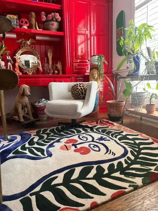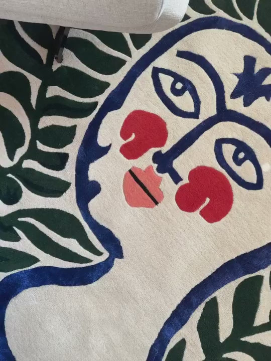 You can find art and style together in the Graceful Visage Hand Tufted Rug. Folk art has a lot of different textures, and this beautiful piece has a modern twist to it. It shows the face of a pretty woman covered in bright flowers and lush leaves. Each tuft tells a story of strength and grace, capturing the spirit of beauty that will always be in style. This rug draws attention to itself and shows off your high-class style. It gives any room a bit of class.