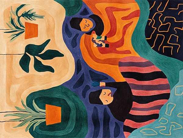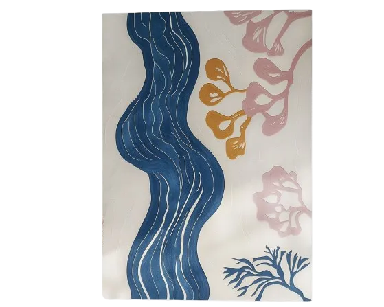 Top view of the Scalloped Serpentine Duo Harmony Hand Tufted Area Rug, featuring an abstract design in soft pink and gold hues. Ideal for adding a unique touch to bedroom and living room spaces, this wool rug offers a blend of elegance and comfort.