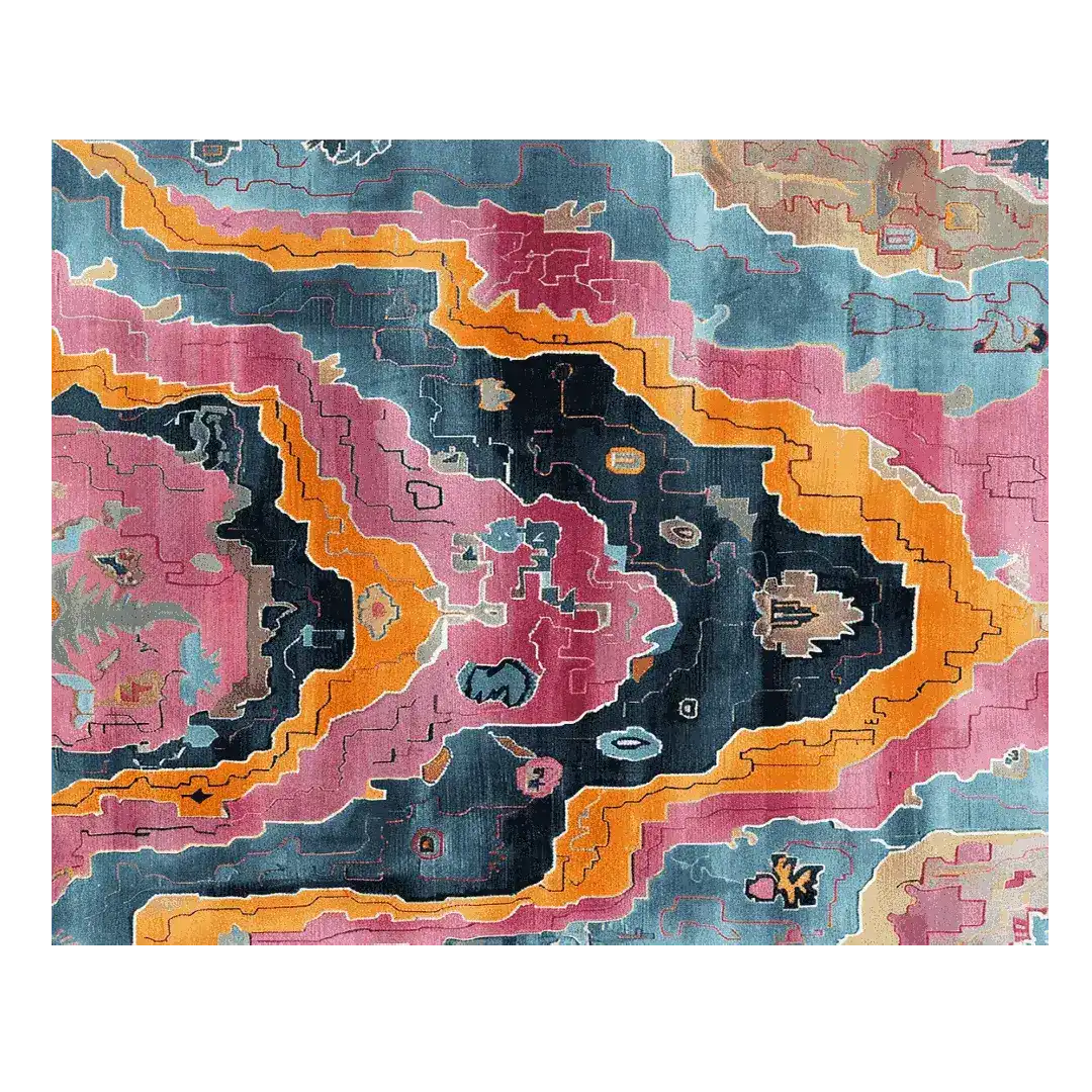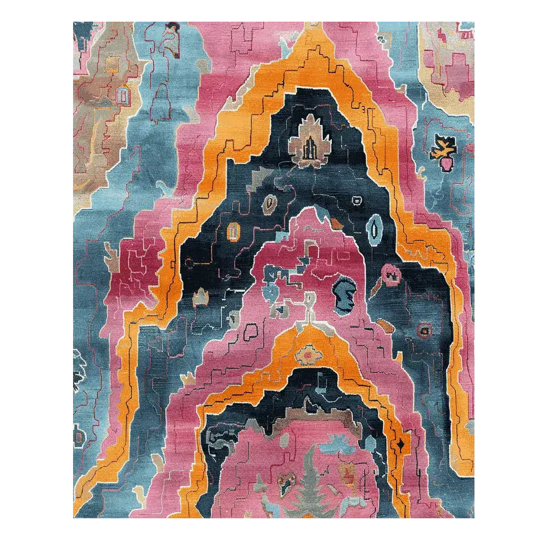 The Contemporary Prismatic Peaks Hand-Knotted Rug is a bold experiment with color and shape that is based on geological layers and topographic maps. The rug has bright bands of orange, magenta, deep blue, and soft pastels that fall in a way that looks like mountains with peaks and valleys. A rhythmic flow is created by the rough, contour-like lines, and the bright colors give the design life and motion. This rug can make any room look like a work of modern art. It's perfect for rooms that need a lively and fun focal point.
