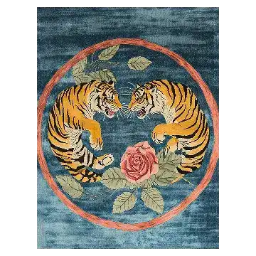 Two tigers fight all the time on the Eternal Duel Hand Tufted Rug, which shows how strong they are. It stands for nature's strength, battle, and balance. The deep blue background makes you feel like you're almost in a magical place. The scene looks very real because the tigers are a bright golden color. The circle frame is thin but strong, and it adds to the idea of a loop that never ends, where strength and beauty meet. The middle rose makes things more peaceful and stands for power and beauty in the wild. It's a sign that strength and beauty can go well together, as this rug shows. Any room will look wild with the Eternal Duel Hand Tufted Rug.
