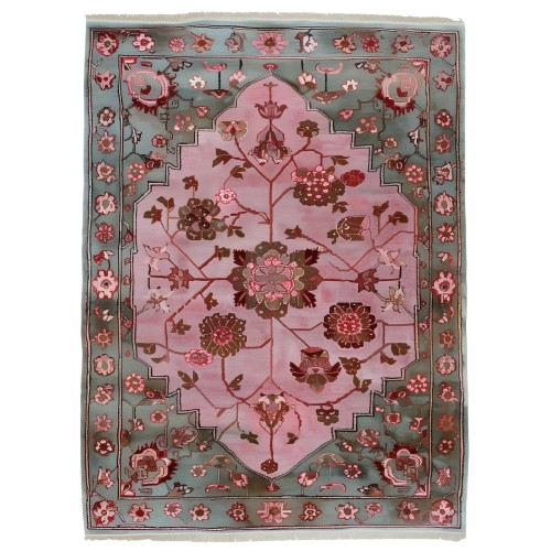 This Floral Scroll Harmony Hand Knotted Rug features an intricate floral medallion design, inspired by traditional Persian artistry. The symmetrical arrangement of blooming flowers, delicate vines, and ornamental details creates a visually balanced composition. A soft, muted base in shades of ivory and light blue contrasts elegantly with warm terracotta, deep brown, and soft teal accents, giving the rug a vintage yet timeless appeal. The ornate border frames the central motif, enhancing its structured elegance. Crafted with meticulous detail, this rug is a perfect blend of heritage and modern sophistication, ideal for adding warmth and character to any space.