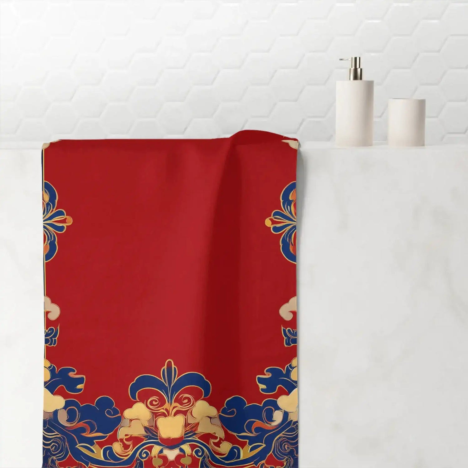 Elevate your bathroom decor with this bold geometric mid-century modern bath towel in a striking red, black, and beige palette. Featuring dynamic sunburst and abstract shapes, this ultra-soft and absorbent towel blends vintage aesthetics with contemporary style. Perfect for adding a touch of retro sophistication to your space.