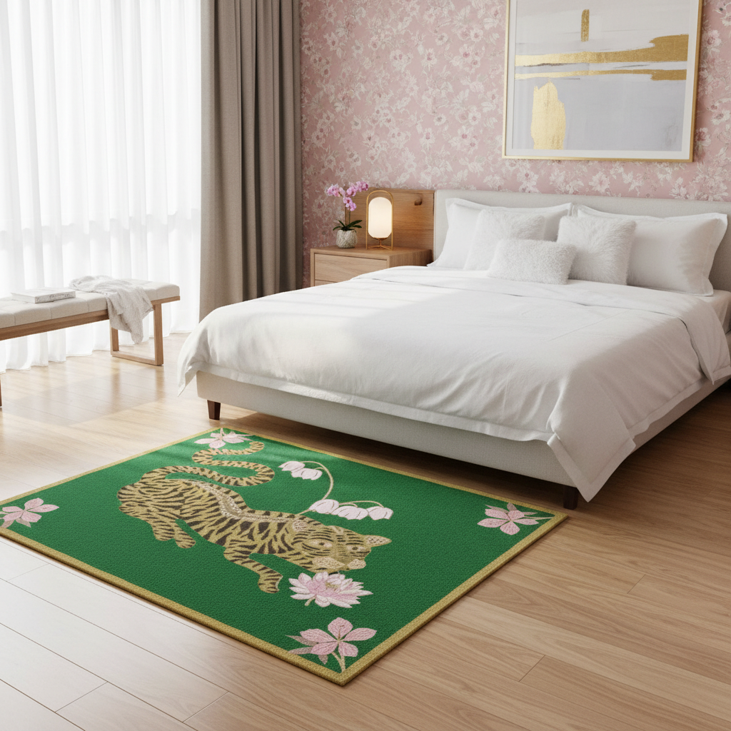 Our Lotus and Indian Tiger Hand Tufted Wool Rug in lush green has fun, crazy designs that you will love. Maximalist art at its finest that doesn't follow the rules. It is really beautiful to look at how this piece of art combines the calmness of lotus flowers with the wild spirit of Indian tigers.