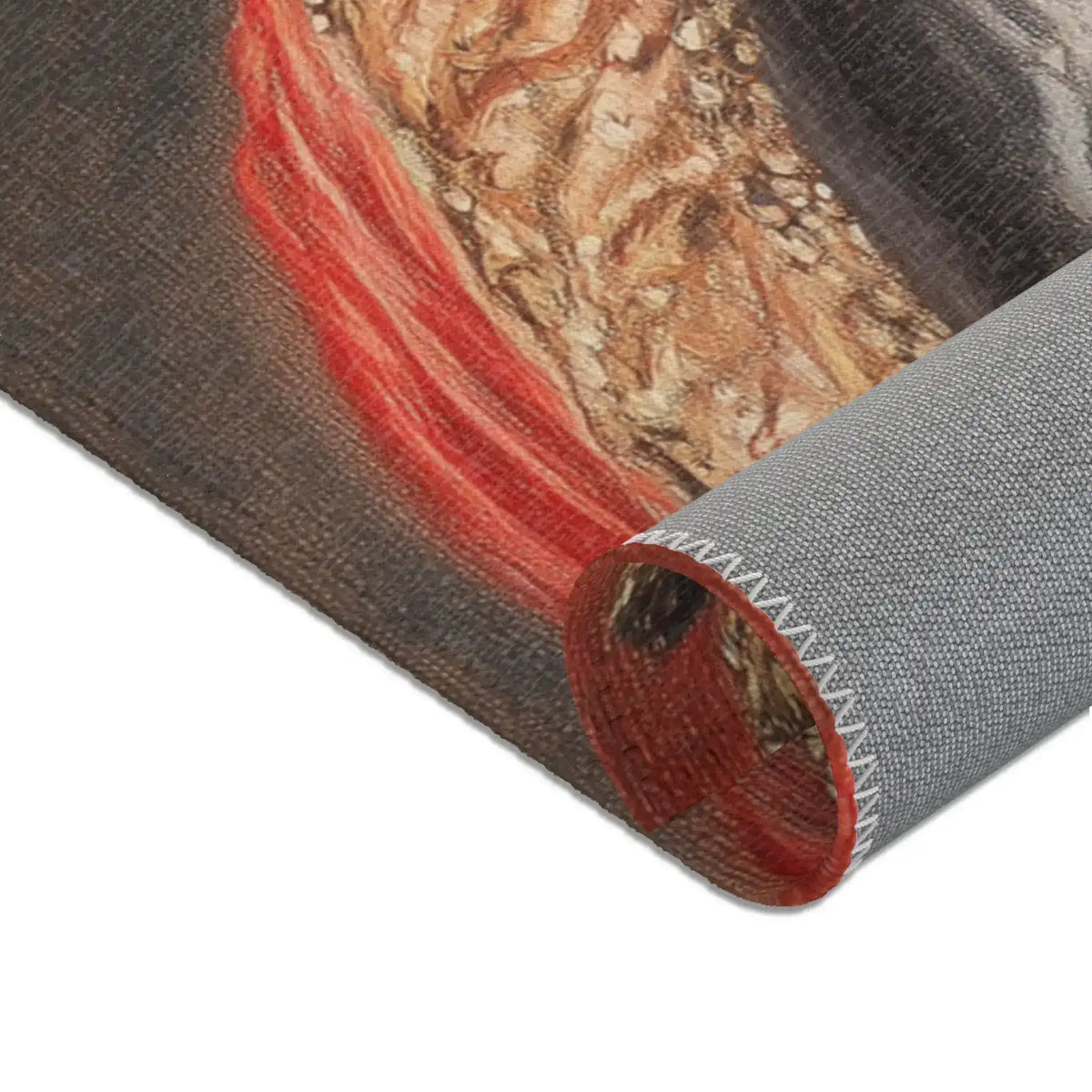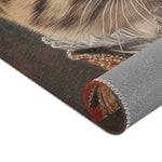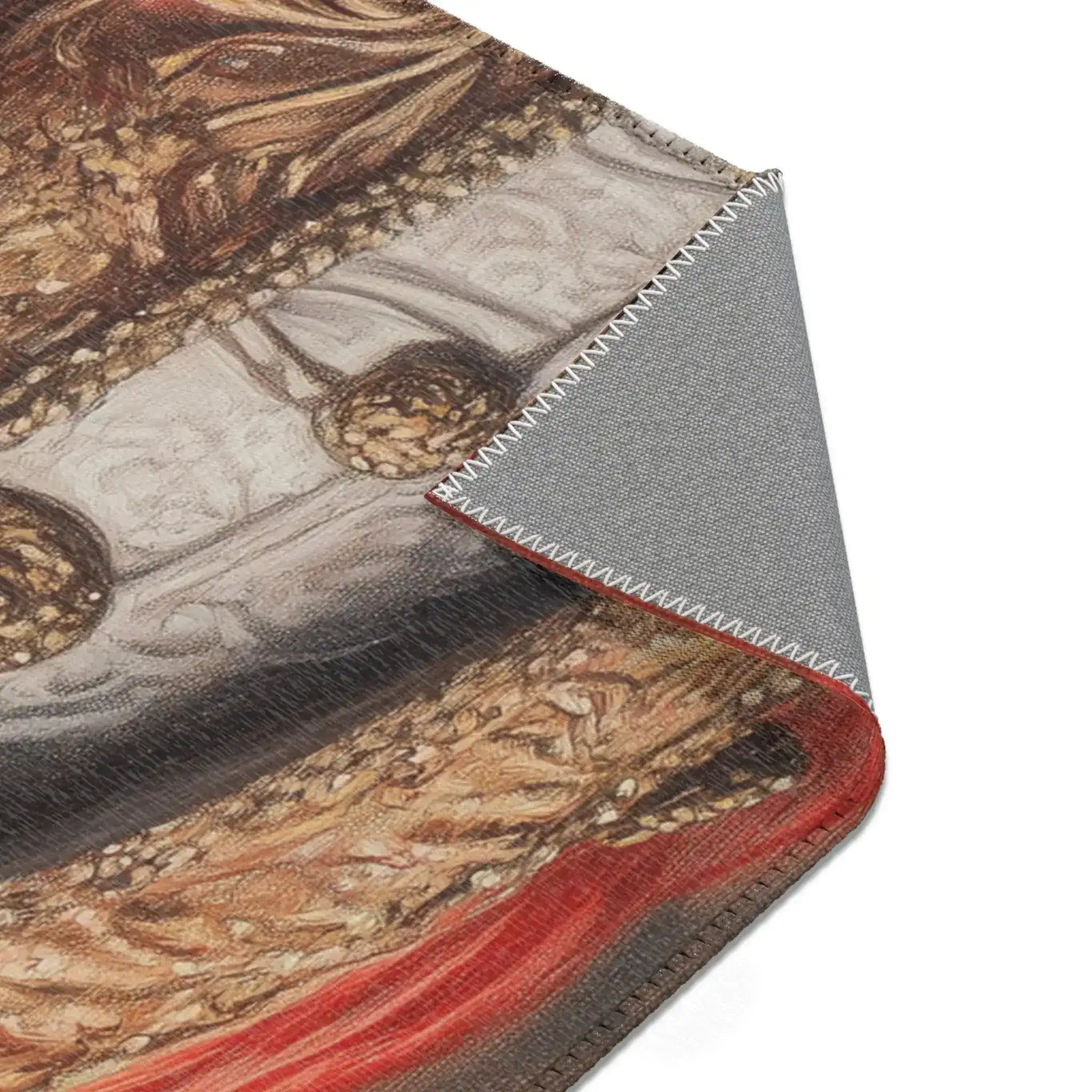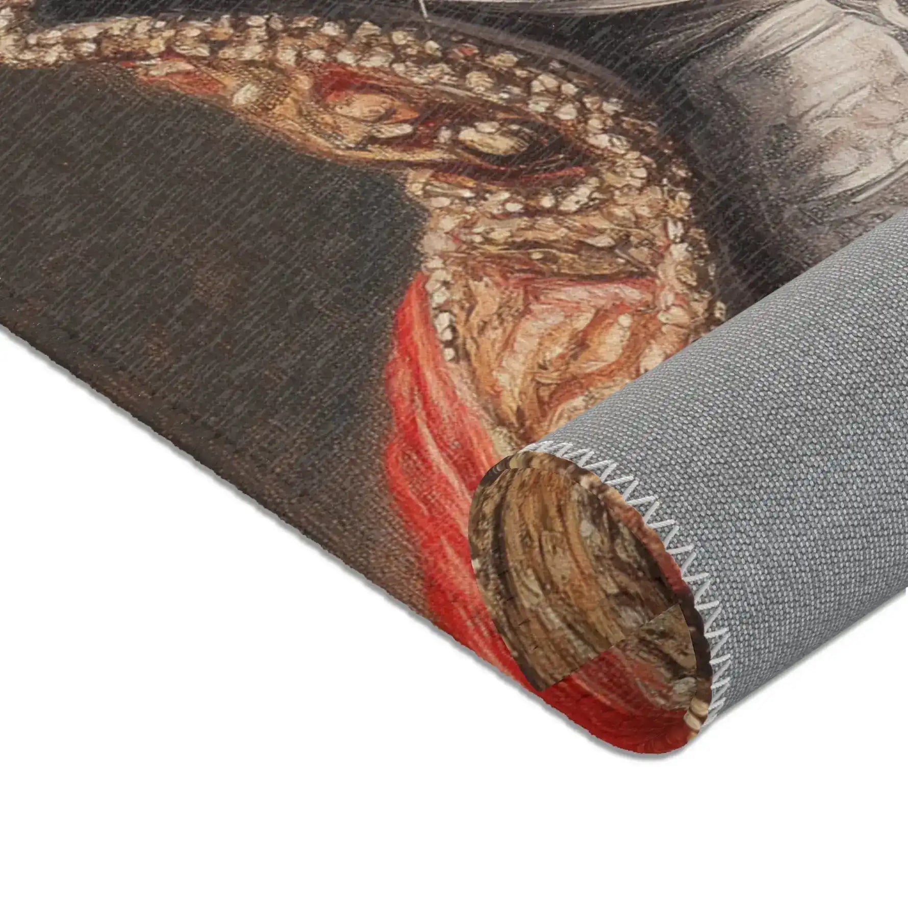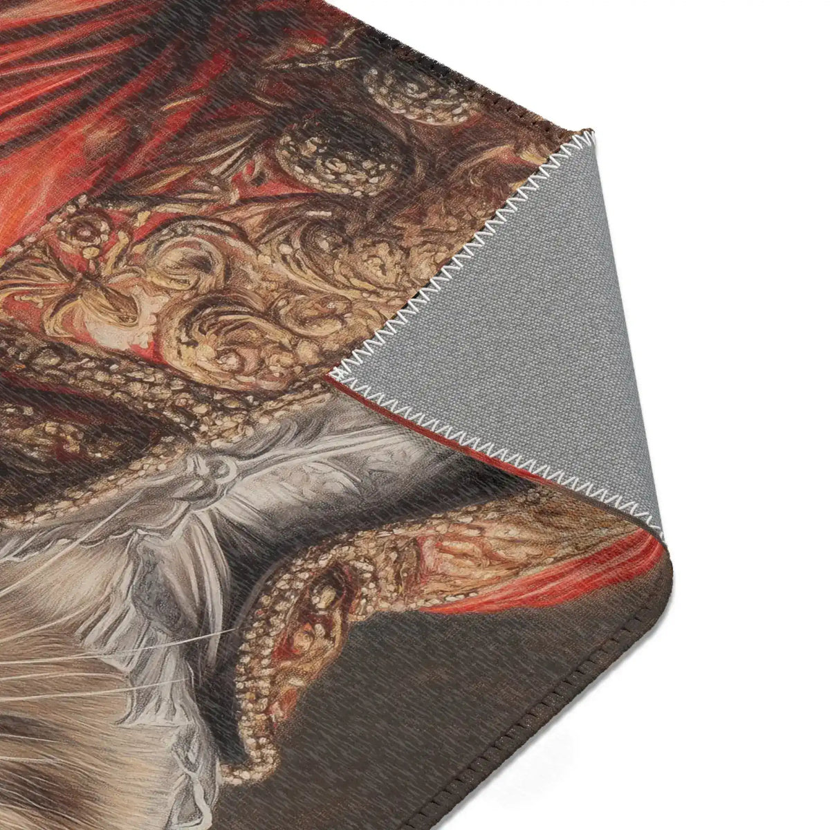 A stylish cat dressed in Renaissance clothes is on this classy floor rug. It will give your room a royal look that will never go out of style. This rug is the perfect statement piece for your home design plan because of its bright colors and detailed patterns that are both classic and modern. People who like fashion and cats will love this book.