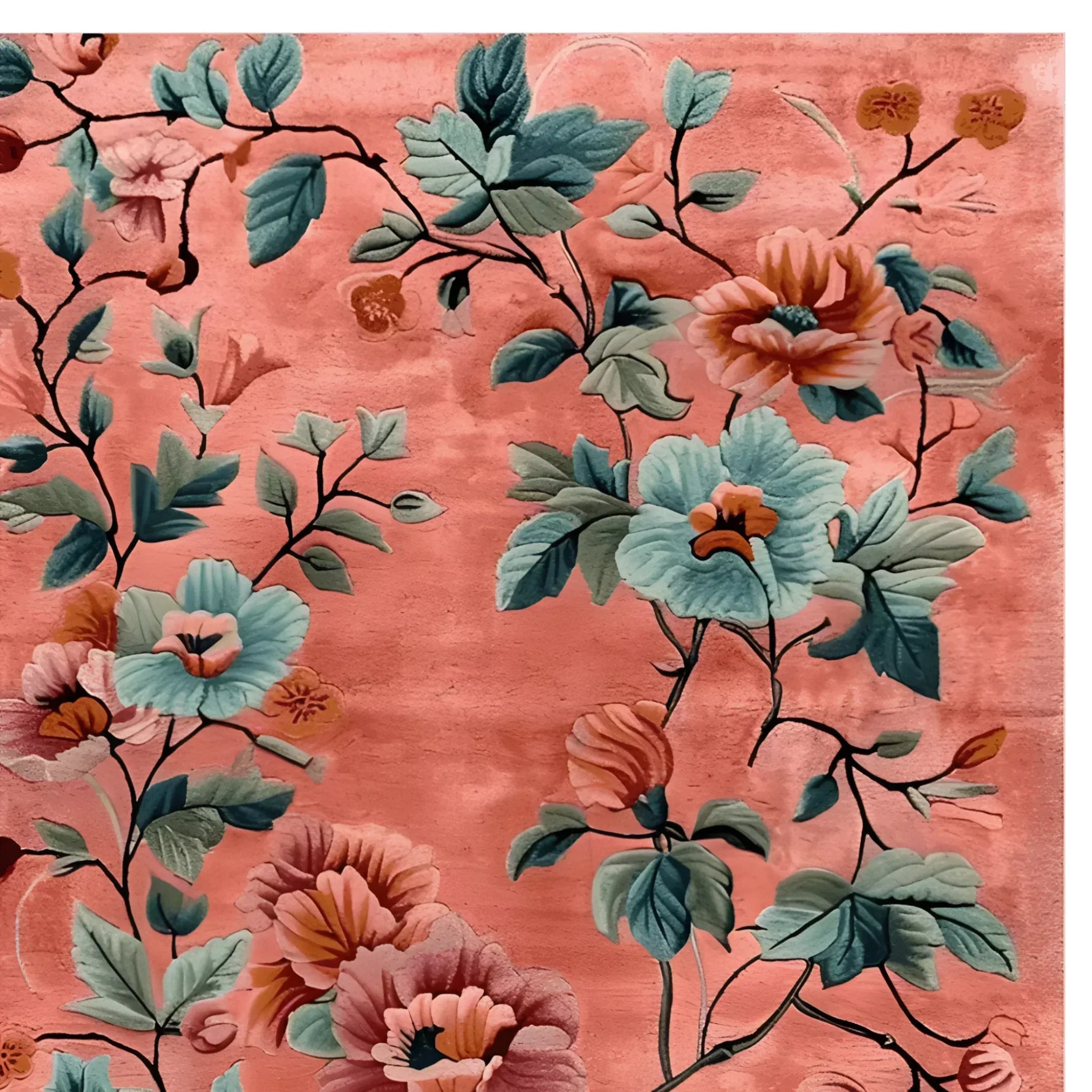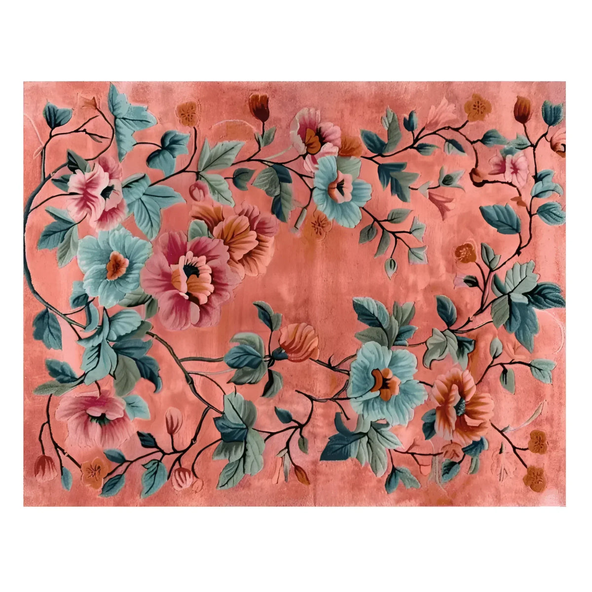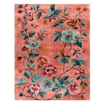 This lovely coral and deep blue Arcadian Embrace Hand Knotted Rug is an ode to the beauty of nature with its lush flower design. The plant moves in a way that makes me think of a yard in bloom in the spring. The flowers and branches are very complicated. There are little things in the picture that make it more beautiful, like the bees flying over the flowers. This rug adds style and warmth to any room, making it an easy place to relax and enjoy art.