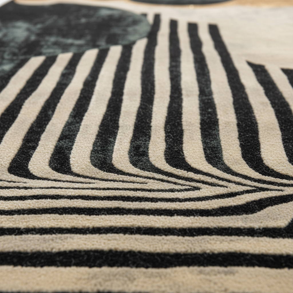 You now have the Black and Gold Striped Rug. This stylish piece will make your room look better right away. The deep black and shiny gold stripes on this rug give any room a touch of class and style. It feels good and will last a long time because the materials are good. Also, it's fun and makes your living room look better.