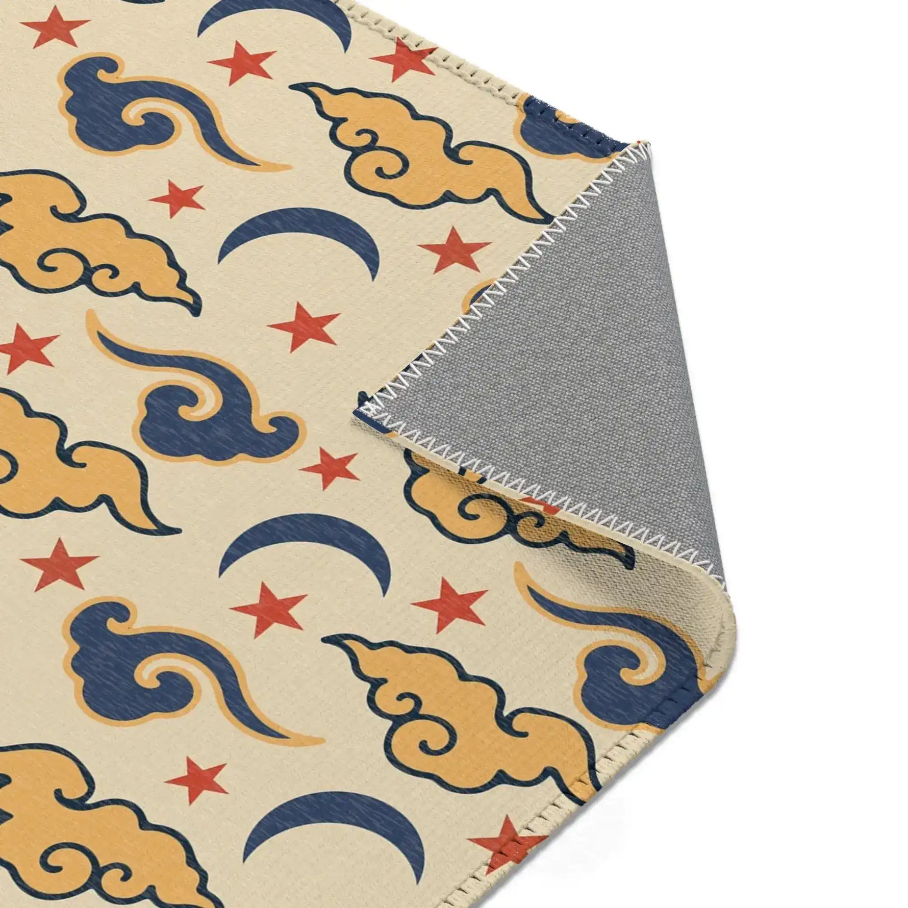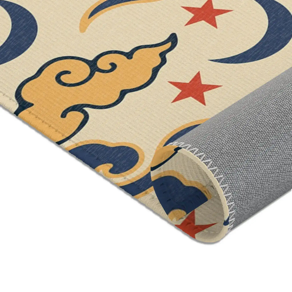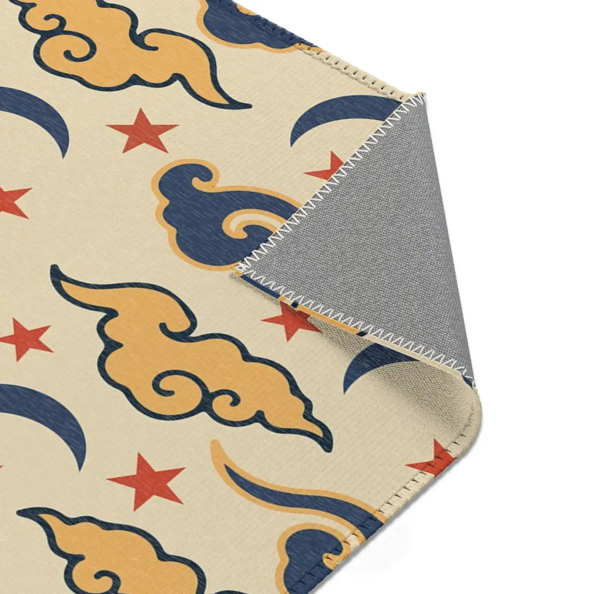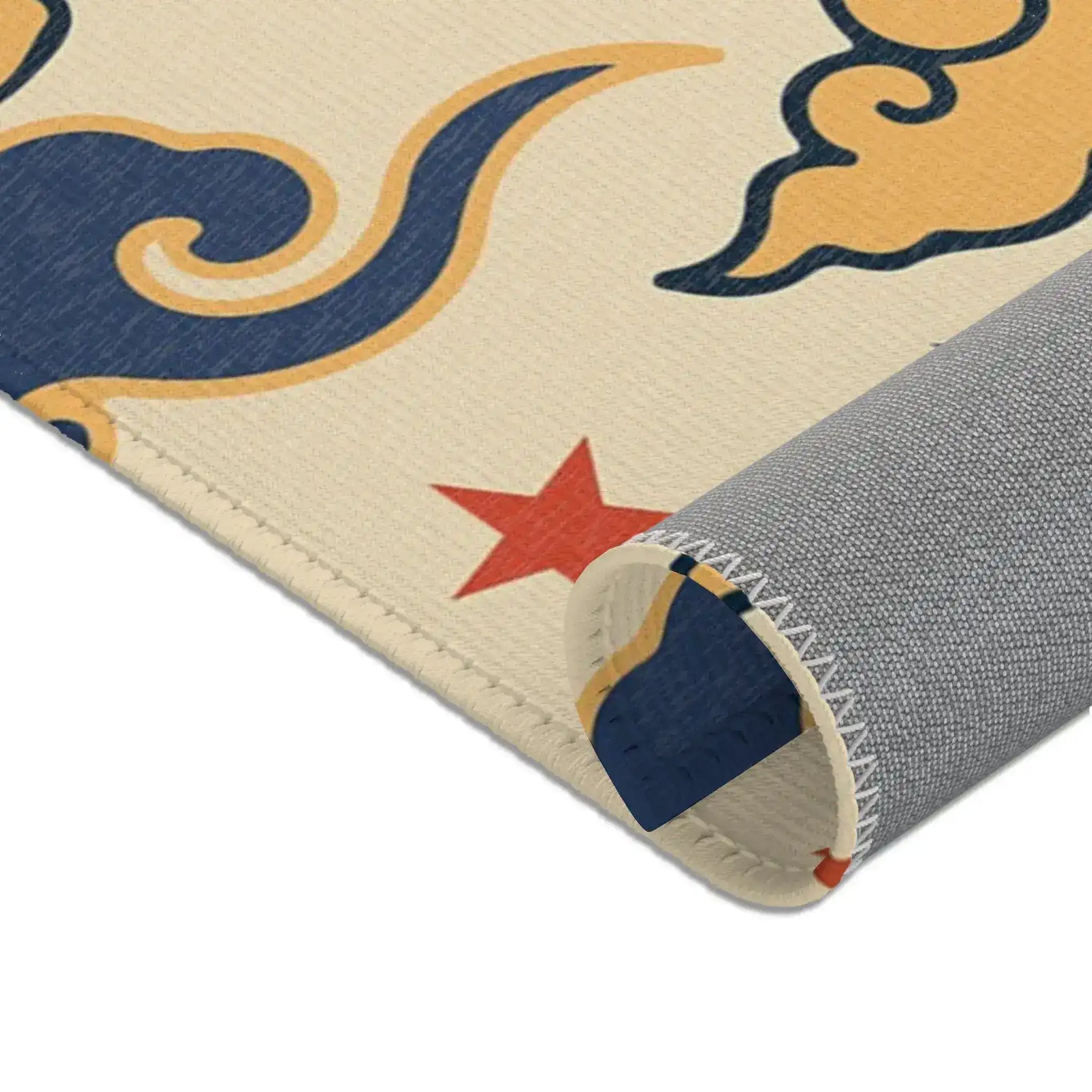 This accent rug features a bold, geometric sunburst design in black, red, and beige. The pattern radiates energy and vibrance, making it a striking addition to any room. The contrasting colors and dynamic shapes create a visually captivating piece that effortlessly enhances modern and artistic home decor.