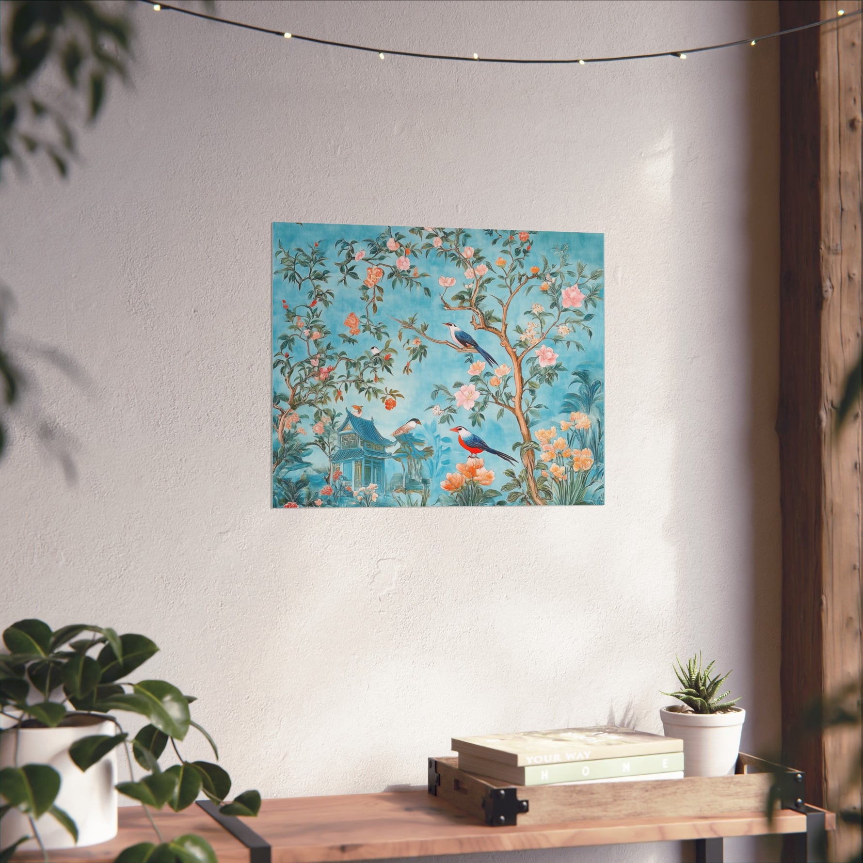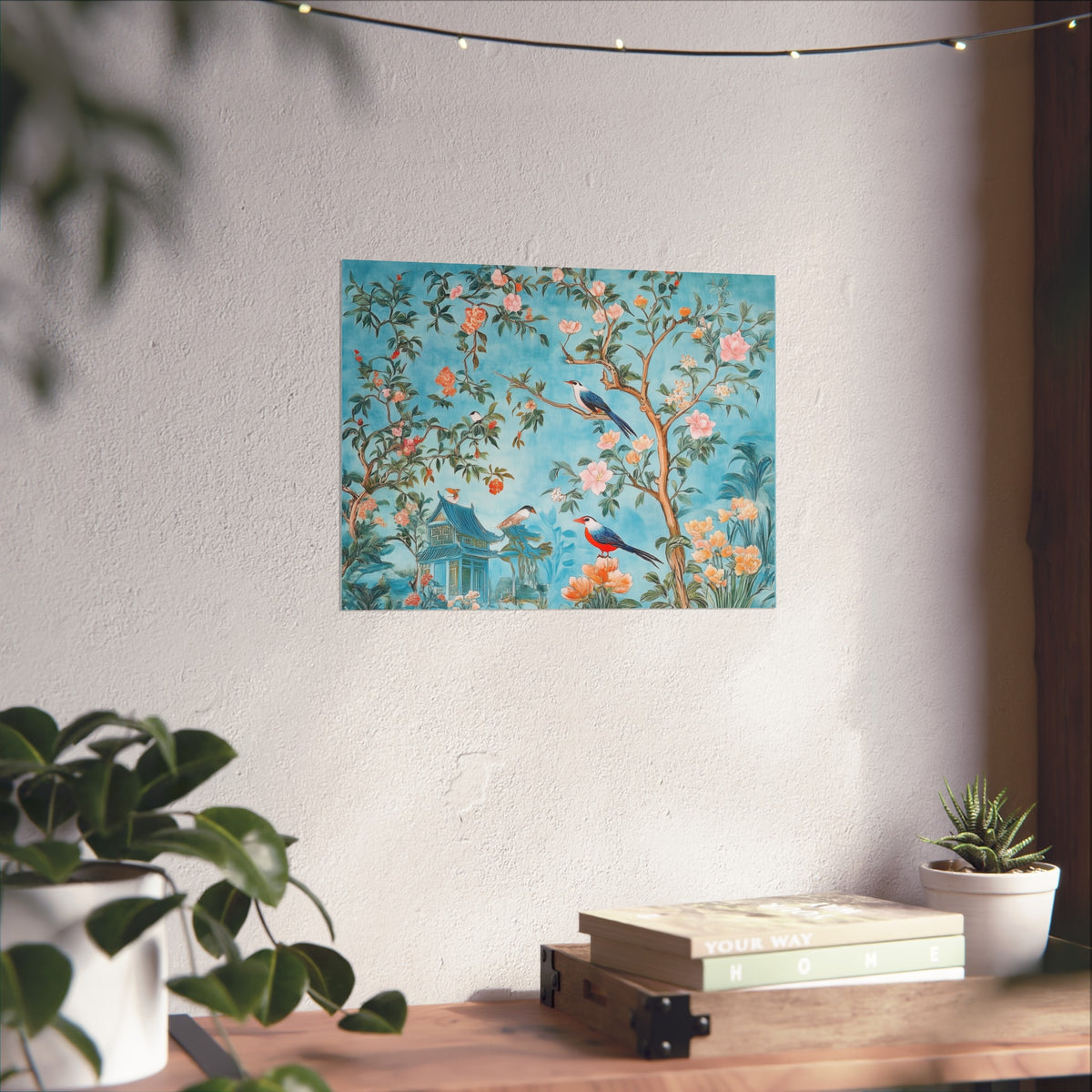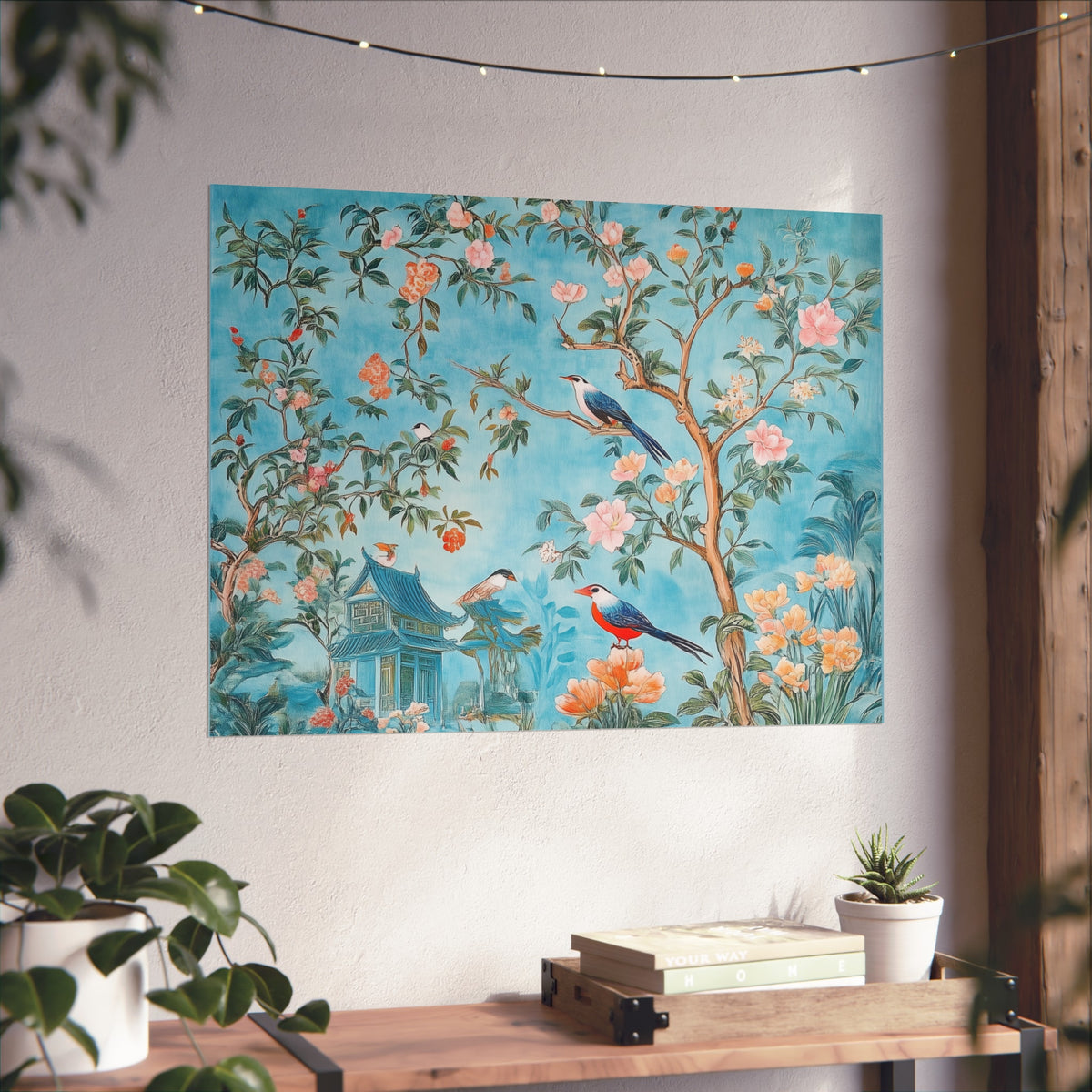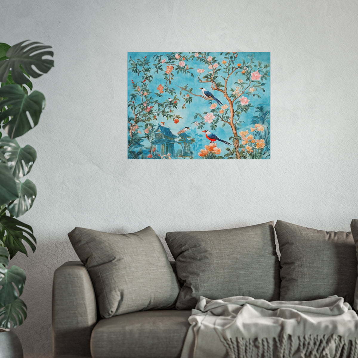 Chinoiserie Birds and Pagoda Fine Art Poster - Blue