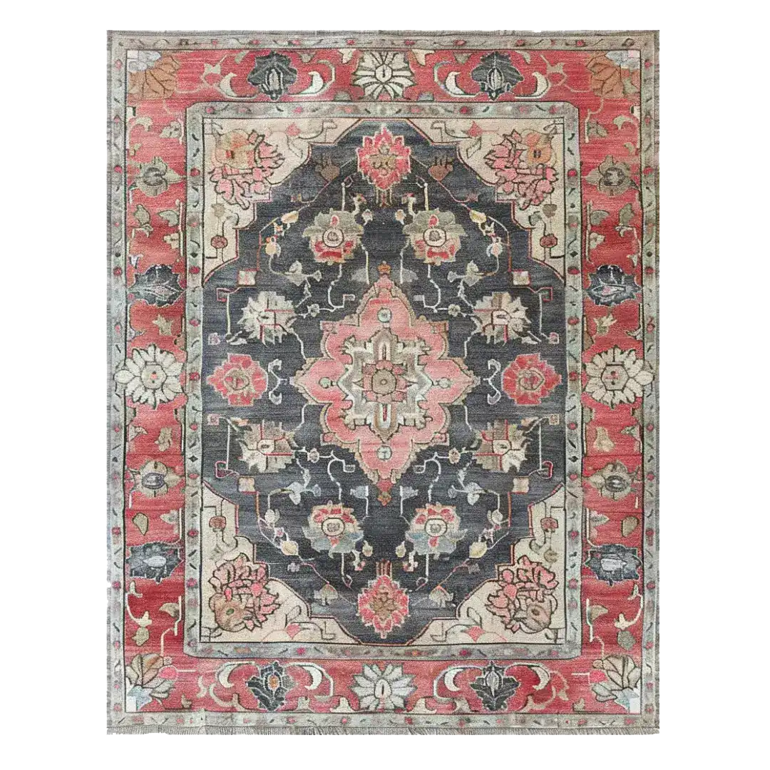 The Faded Elegance The hand-tufted wool rug has soft colors and a basic look that go well together. It has a classic look and an old-fashioned charm. Its base color is a worn-down charcoal, and the soft blush and white highlights that make up a small pendant in the middle and complex flower designs all around it look stunning. The finish looks old and used, which makes it feel like a gem. The deep, warm red border around the design finishes the look. This rug gives any place a bit of old-world elegance and charm. It looks great in cozy living rooms, quiet bedrooms, or rooms that have a country vibe.