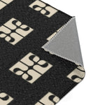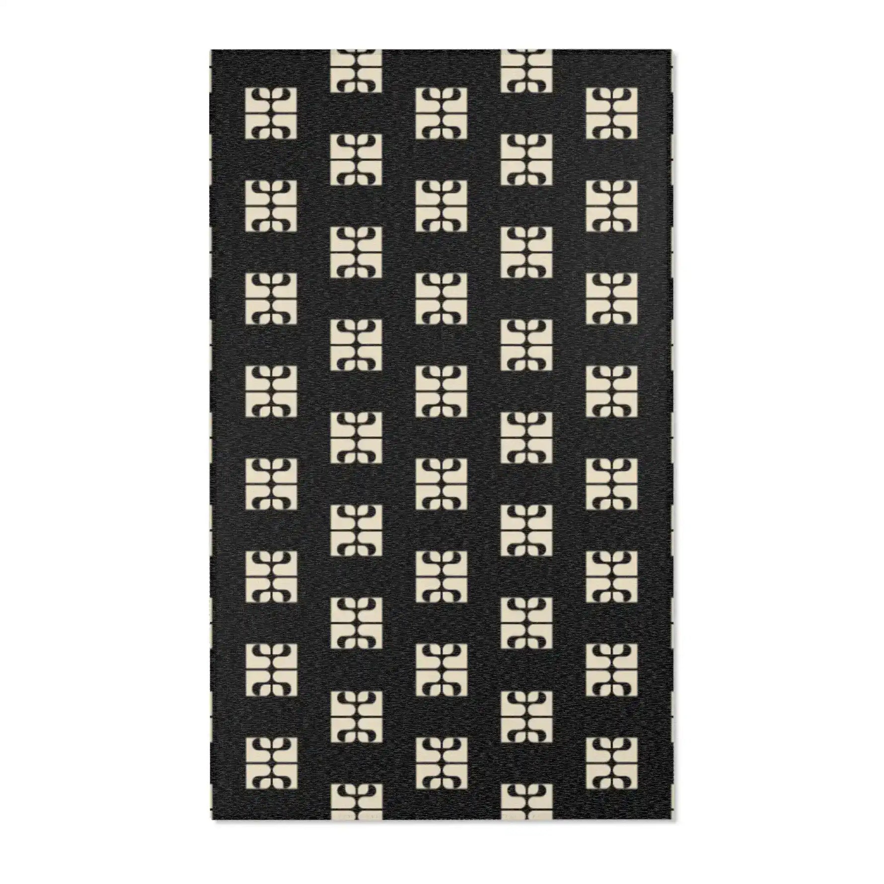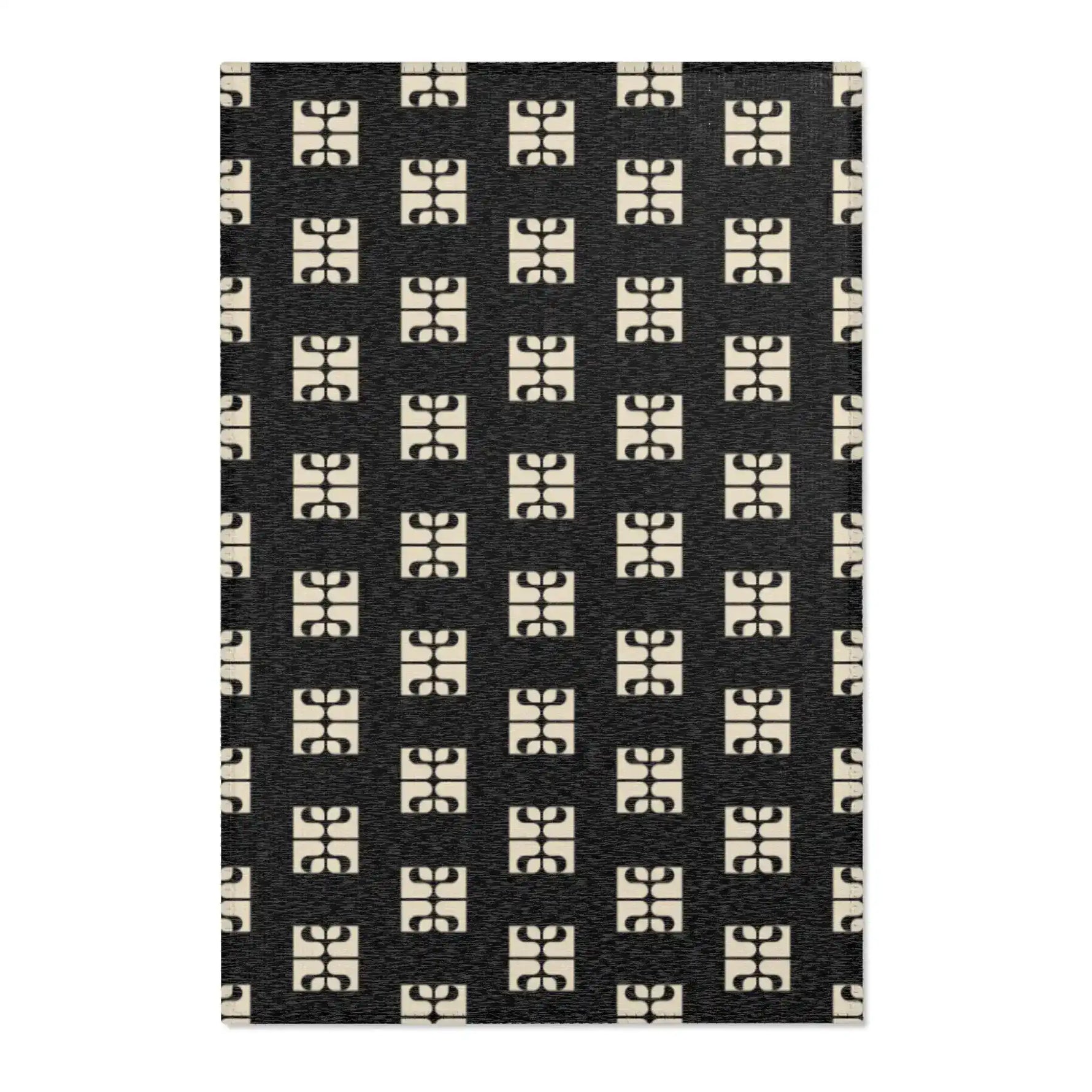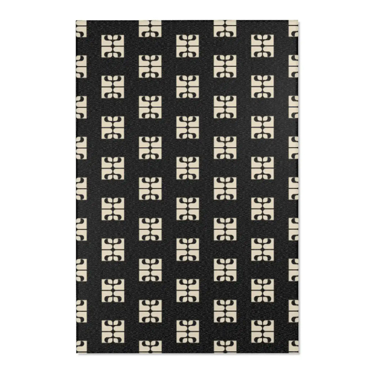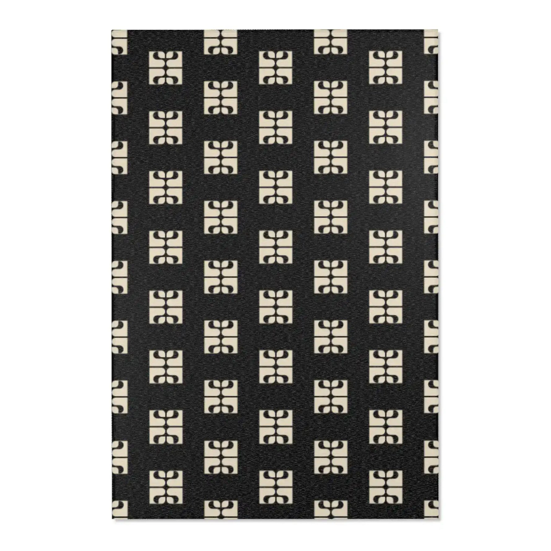 This accent rug features a bold, geometric sunburst design in black, red, and beige. The pattern radiates energy and vibrance, making it a striking addition to any room. The contrasting colors and dynamic shapes create a visually captivating piece that effortlessly enhances modern and artistic home decor.