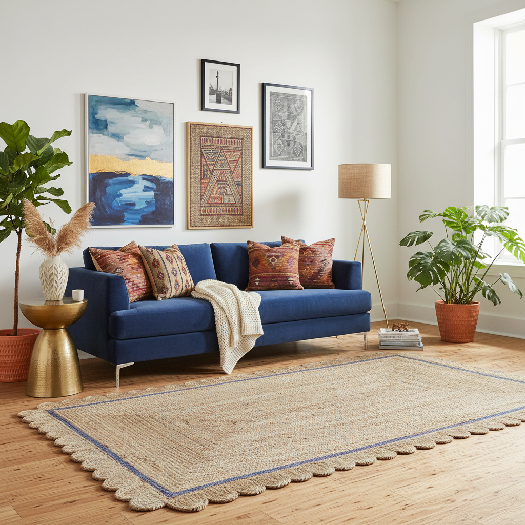 This elegant Handmade Mini Scallop Jute Rug features a natural jute texture with a subtle blue border, perfect for enhancing your living room. The area rug's scalloped edges add a unique touch, making it an ideal choice for rugs for living room, especially in an 8x10 size.