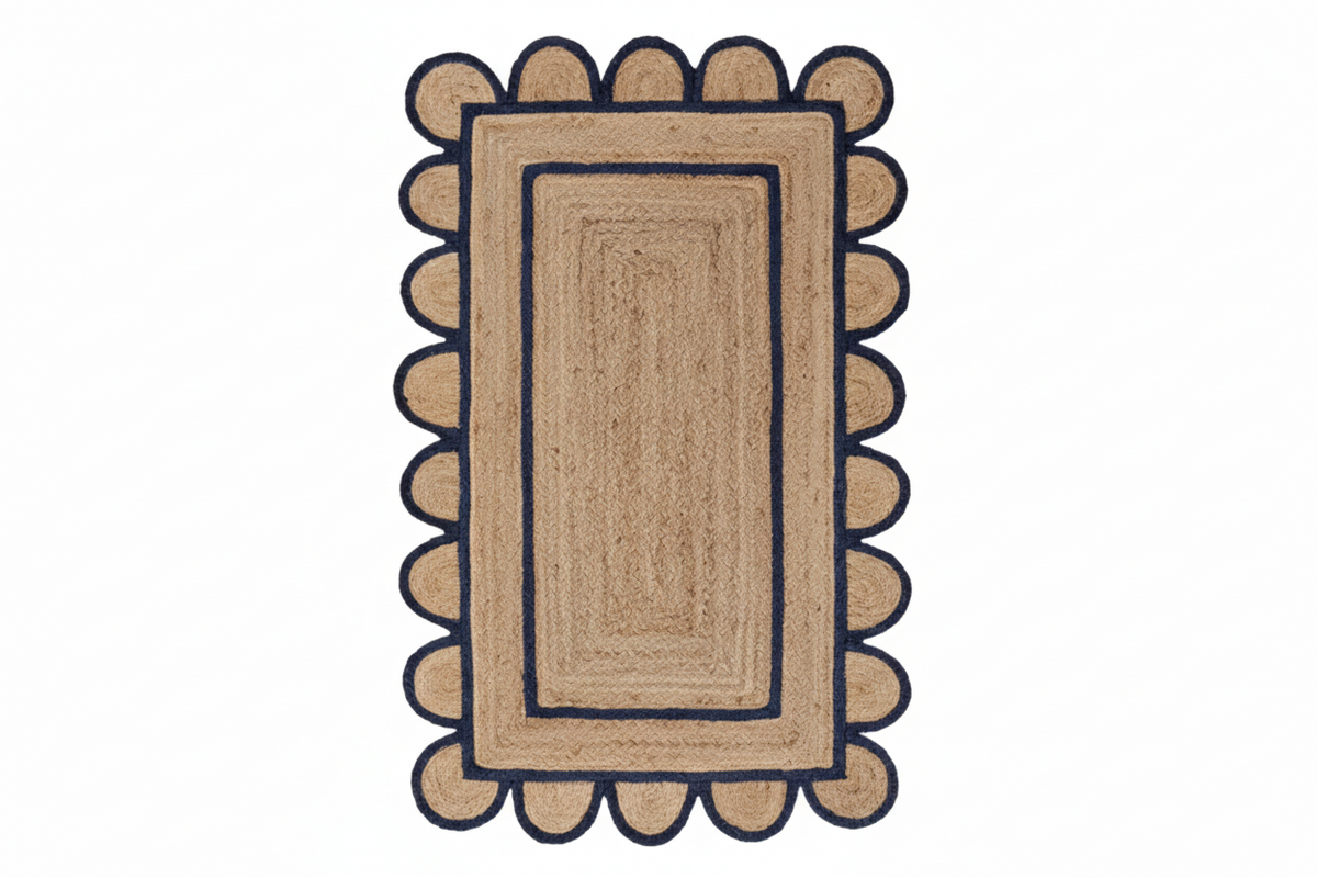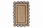 Rectangular jute rug with scalloped edge on a white background