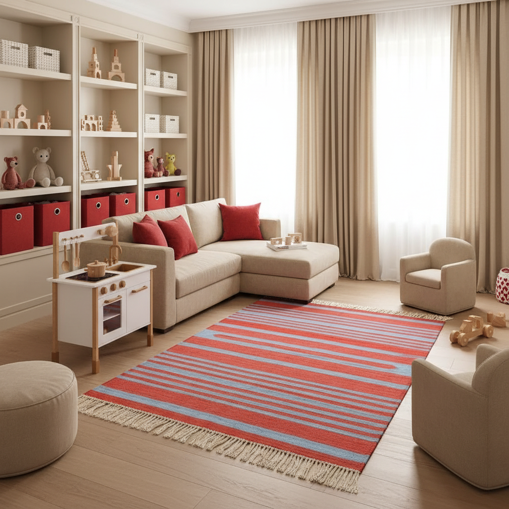 Take a step back in time with our Handwoven Red and Blue Stripe Cotton Rug. It's a colorful mix of style and tradition. Each thread tells a story, and together they make a story of workmanship that will last forever. With its strong colors and fringes, this rug is more than just a piece of decor—it's a trip through time that you can take right at your feet.