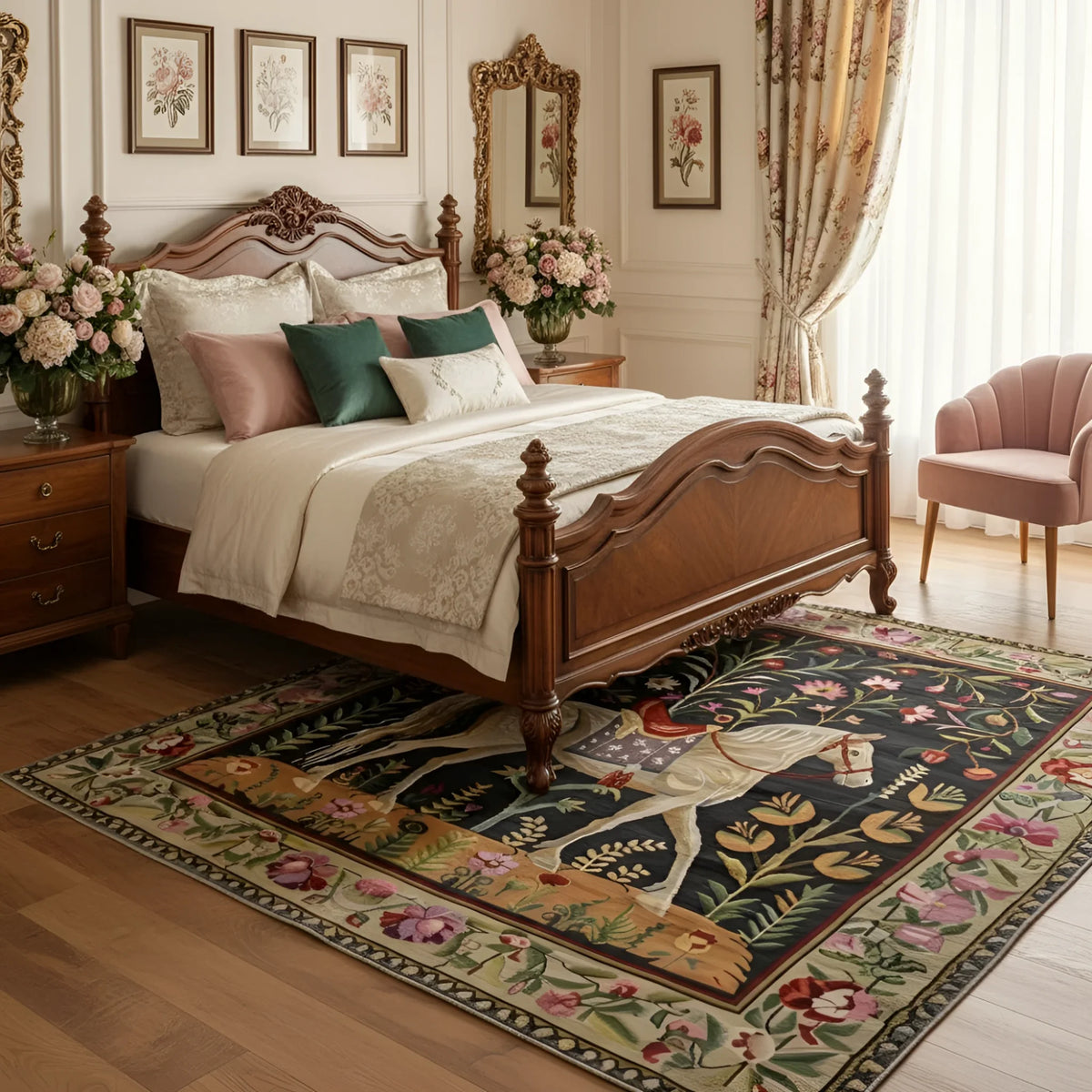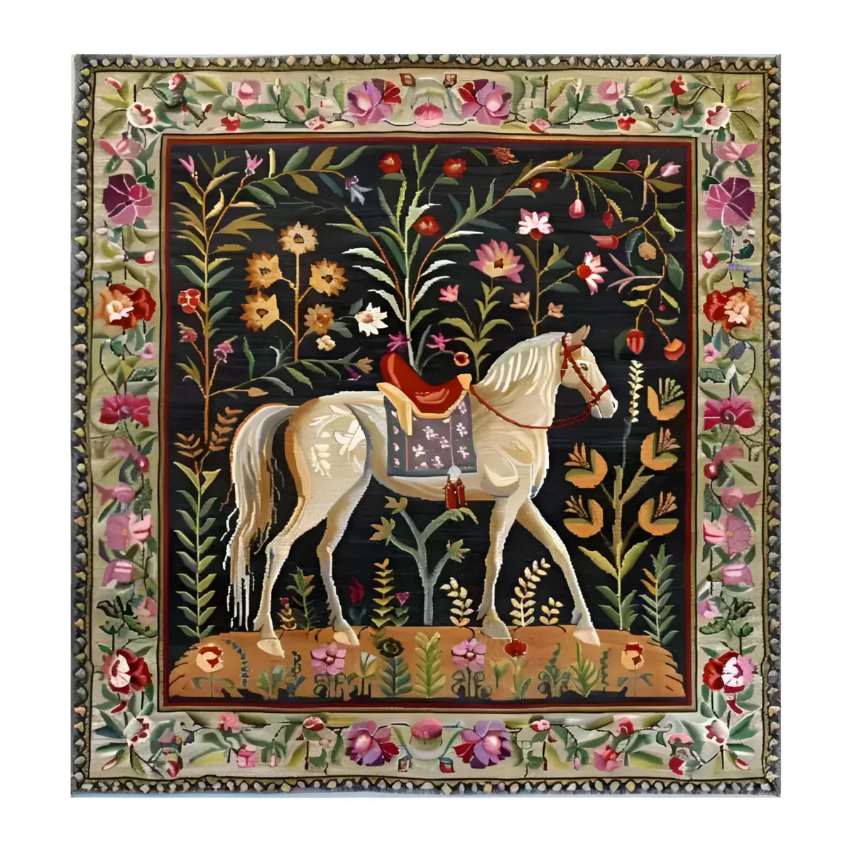 The Horse & Blossom Wool Hand Knotted Area Rug is a lovely piece that honors nature's beauty and horses' grace. This rug's intricate designs tell an interesting story through the combination of a pretty horse and bright flower patterns. Handcrafted from soft, long-lasting wool, this rug would look great in any living room. There is a touch of class and charm in this rug. It makes your home a calm place where art and nature meet.