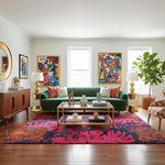The Jungle Chic Hand-Tufted Rug takes you to a place where wild things happen. A striking black background sets off the fierce beauty of the orange leopard faces and the lushness of the pink monstera leaves in this rug. I picture a tropical paradise where the bright colors of nature are the main draw. The pattern is very complicated. Cautious and skilled work went into making it. It gives any room a strange glow and makes you feel like you're on an adventure. In honor of the beauty and drama of nature, this rug will make your room look like a stylish jungle getaway.