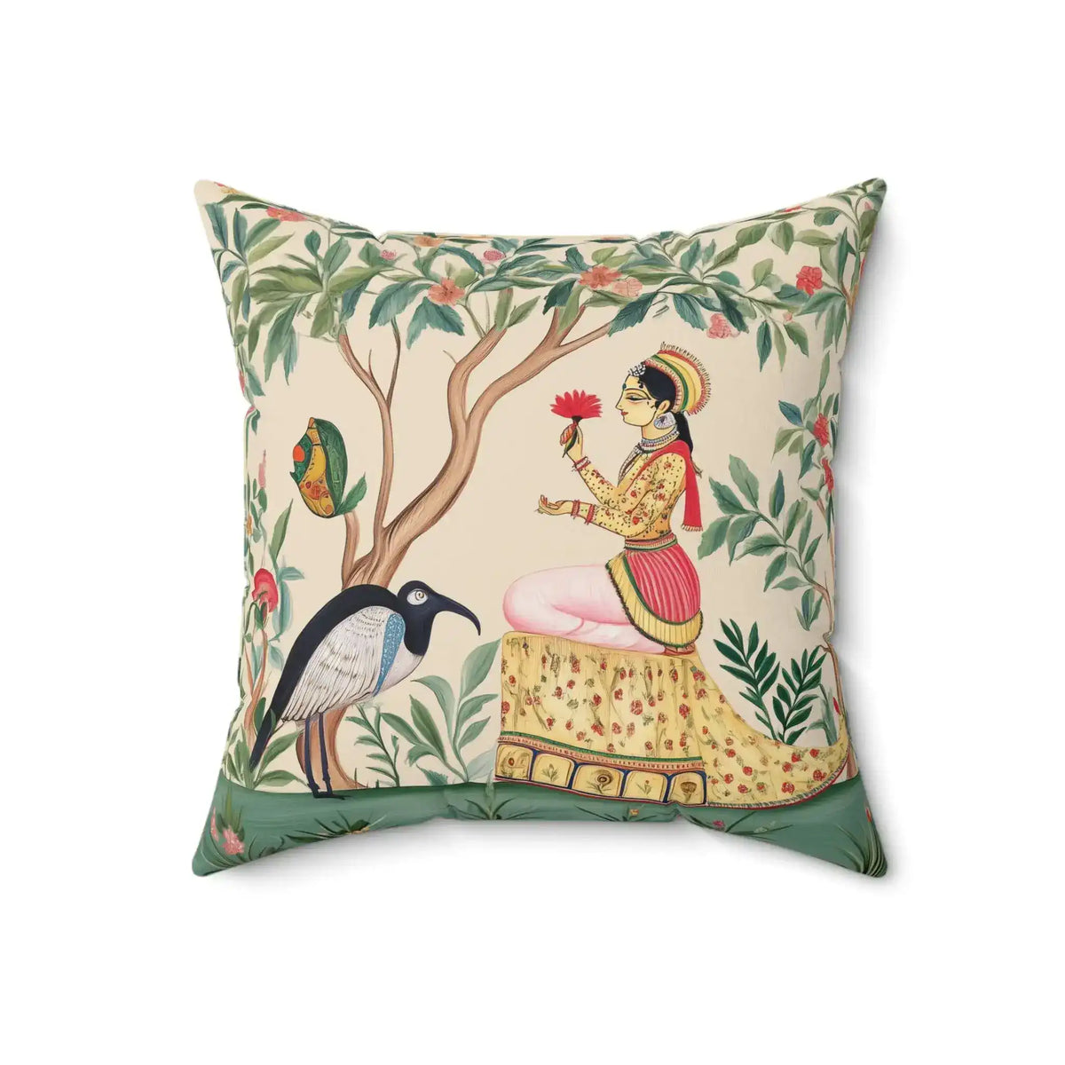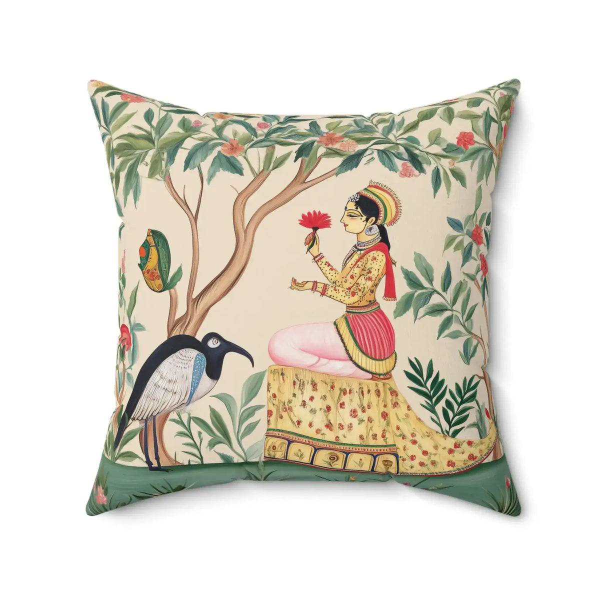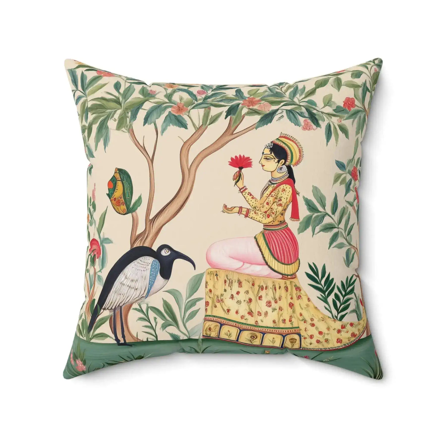 Elevate your space with the ethereal beauty of this Art Nouveau-inspired throw pillow. Featuring a dreamy scene of a young woman gliding through the sky on an intricately designed pink magic carpet, this artwork blends soft pastels with elegant details for a truly enchanting touch. Perfect for adding a whimsical yet sophisticated charm to any living space or bedroom.