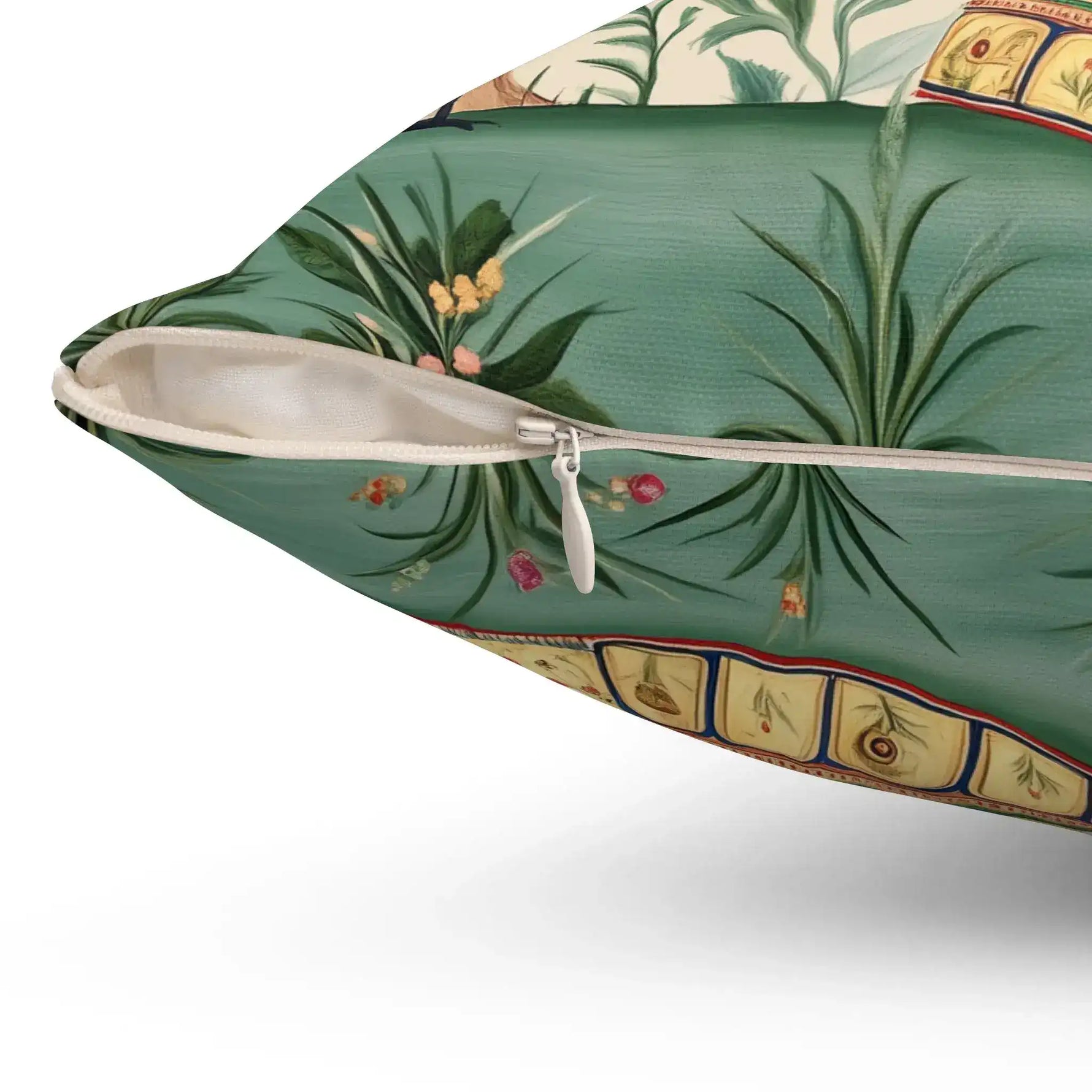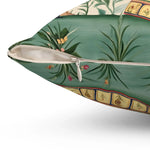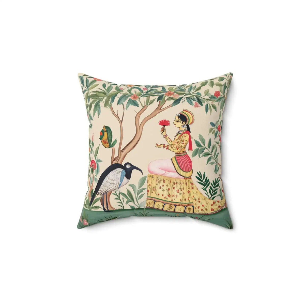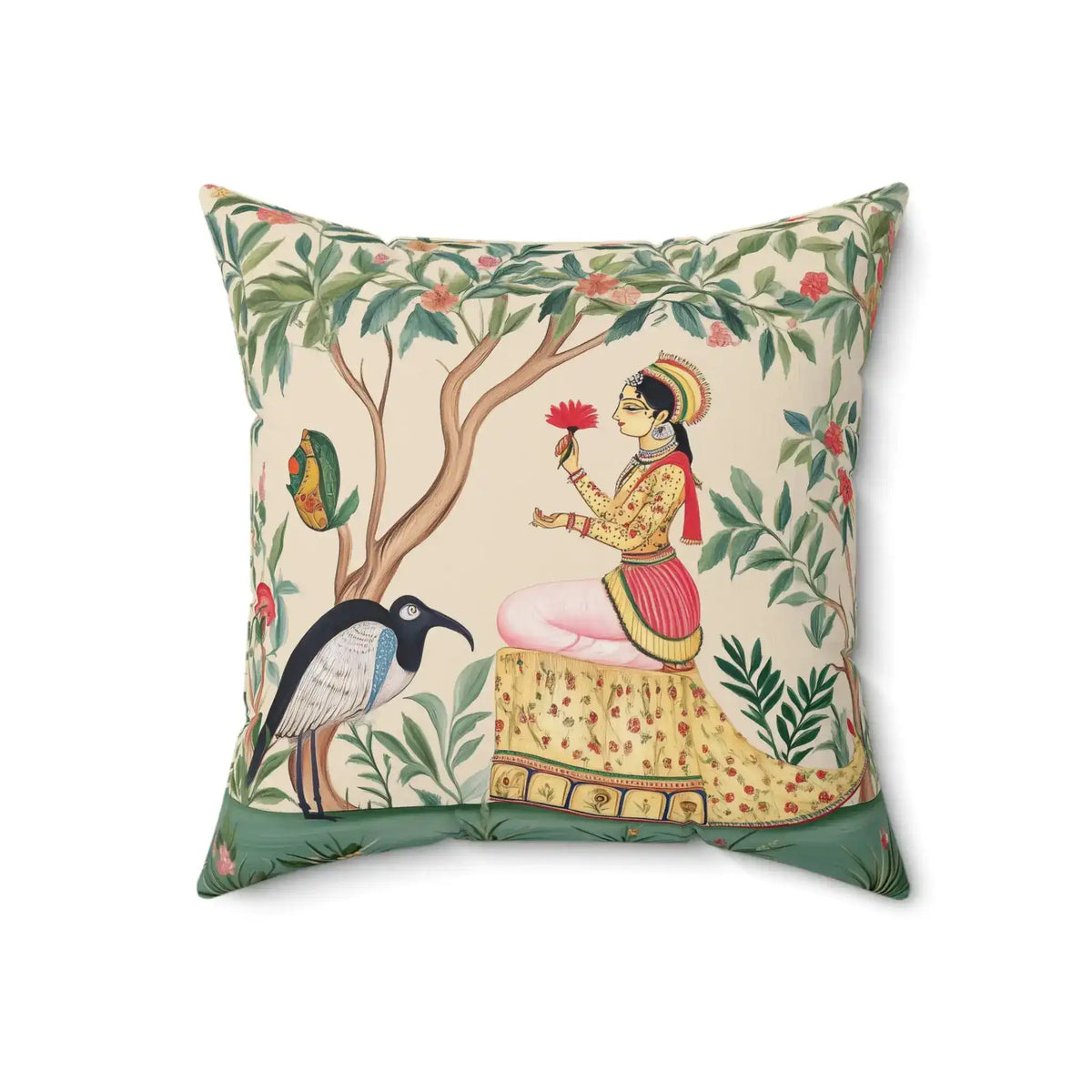 Elevate your space with the ethereal beauty of this Art Nouveau-inspired throw pillow. Featuring a dreamy scene of a young woman gliding through the sky on an intricately designed pink magic carpet, this artwork blends soft pastels with elegant details for a truly enchanting touch. Perfect for adding a whimsical yet sophisticated charm to any living space or bedroom.