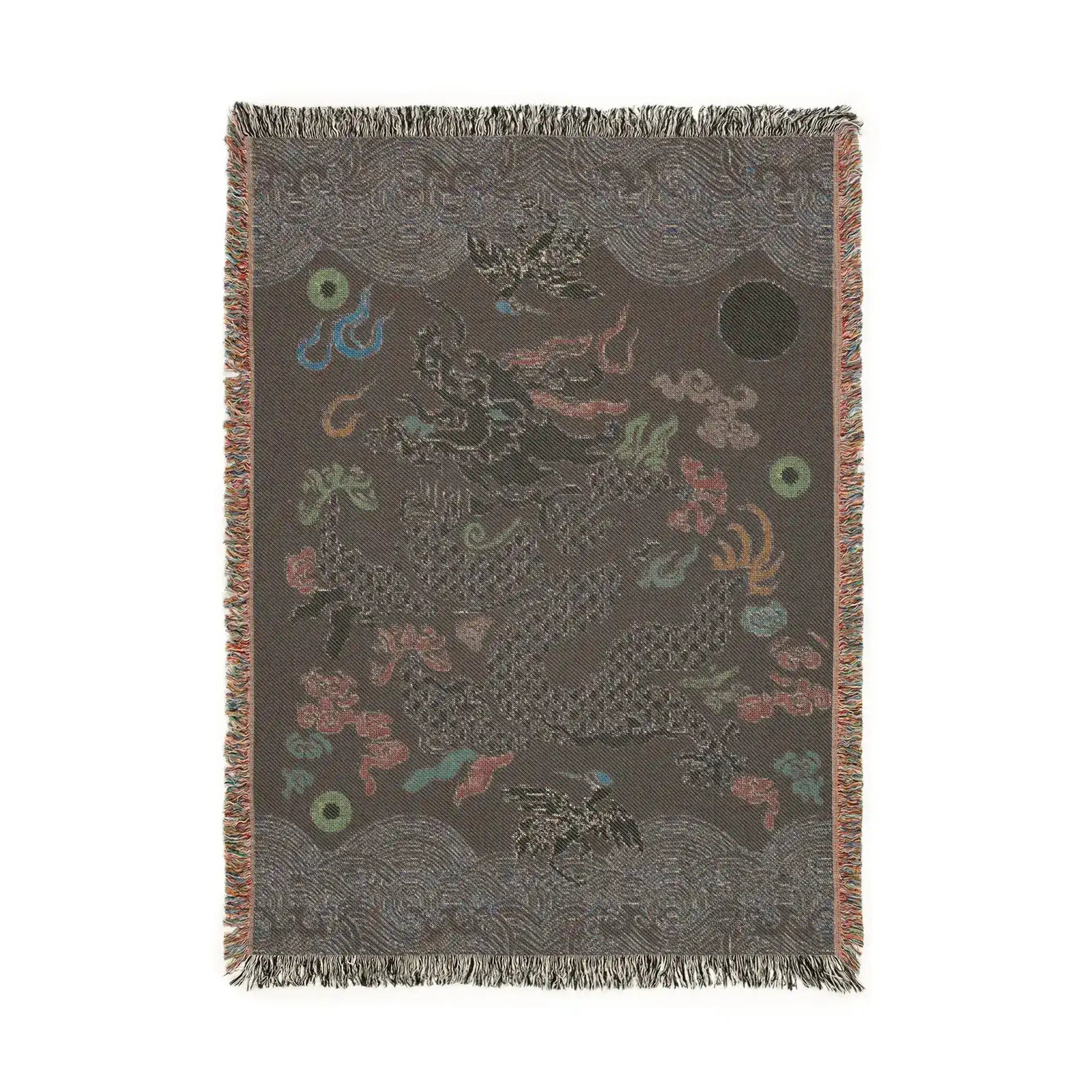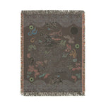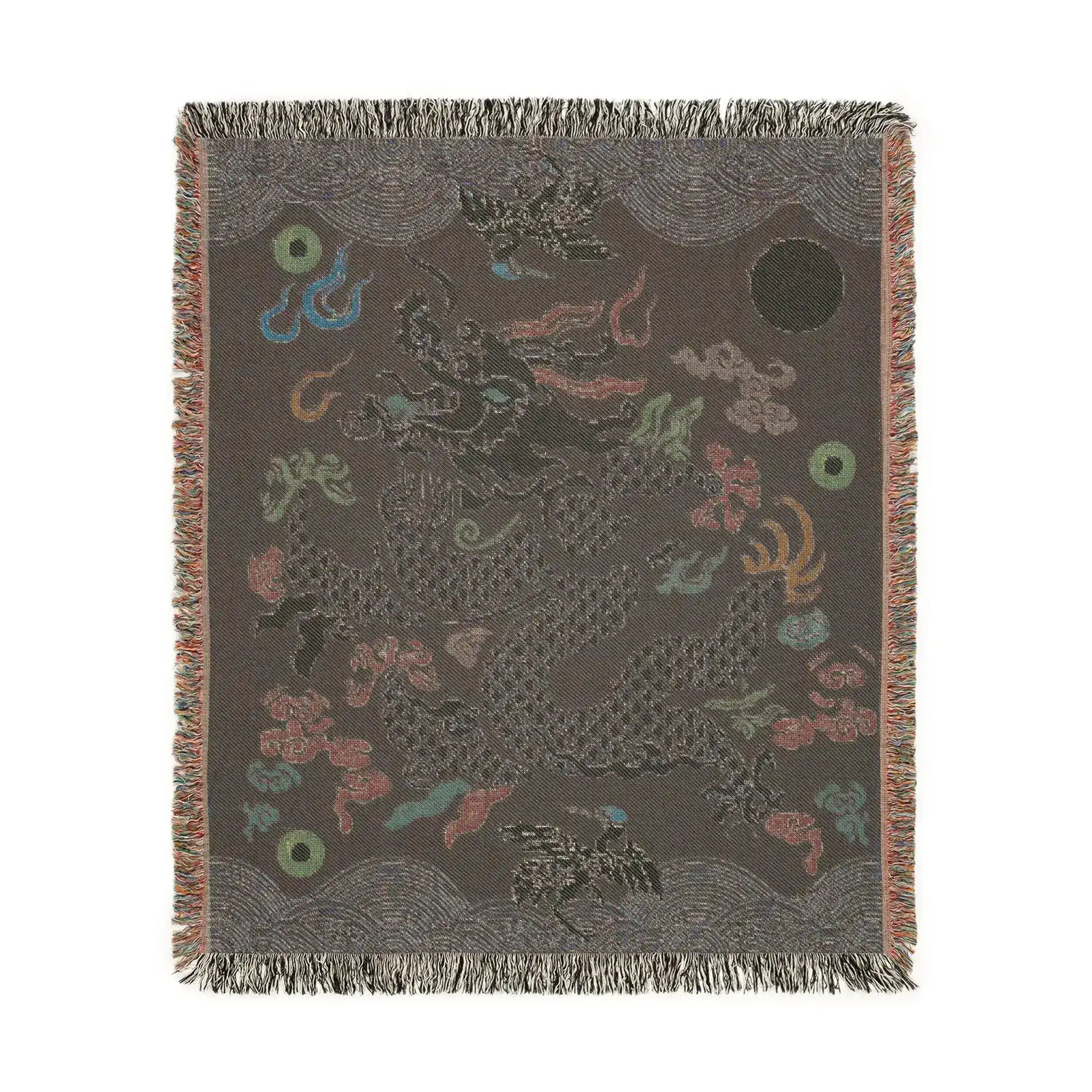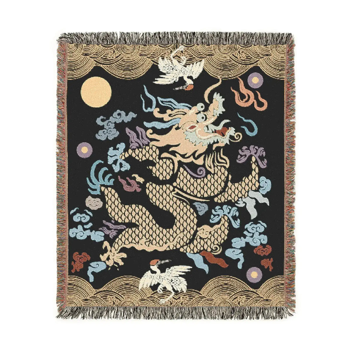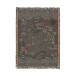 This woven blanket features an abstract design with bold, contrasting colors. The pattern includes large sunburst shapes in black and beige, interspersed with striking red geometric elements. The dynamic interplay of lines and shapes creates a visually stimulating and modern aesthetic, making it a unique and eye-catching piece for any home decor.