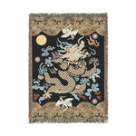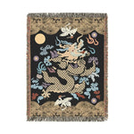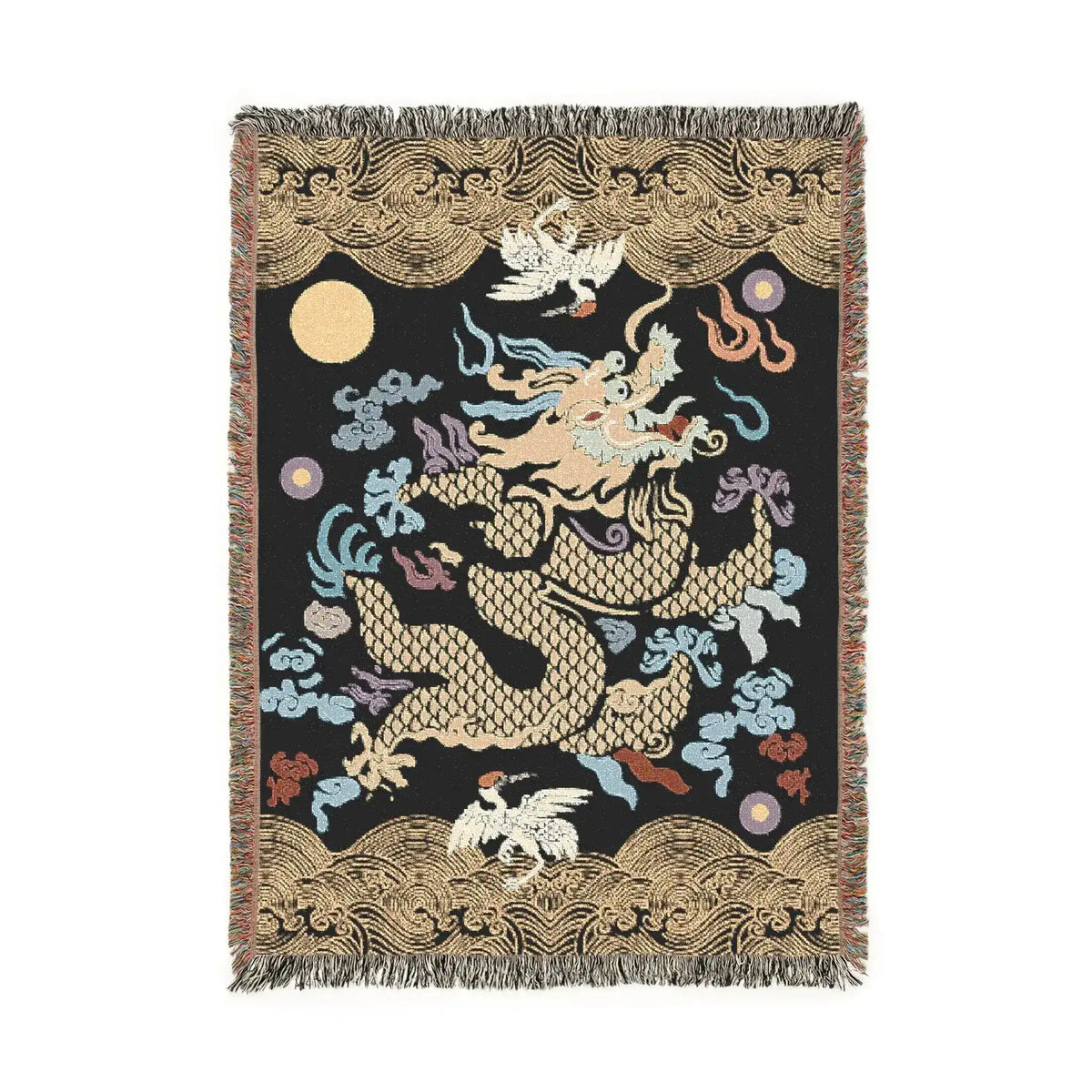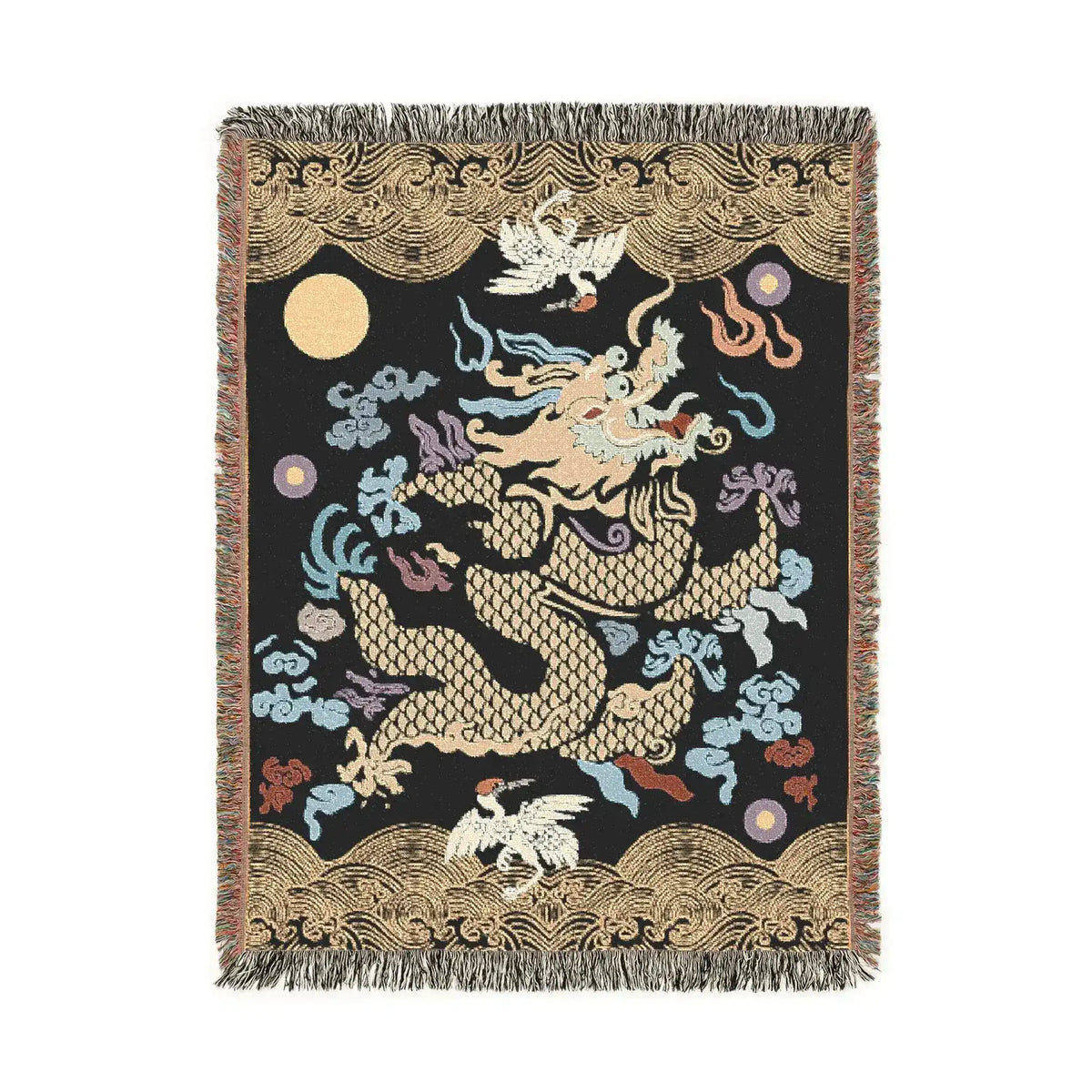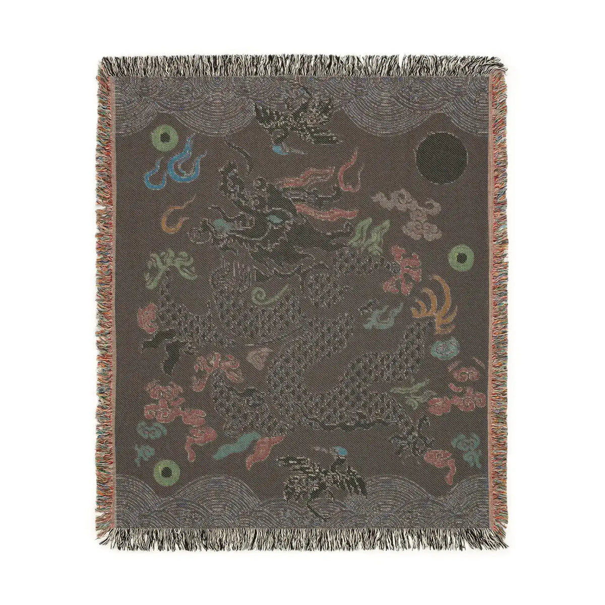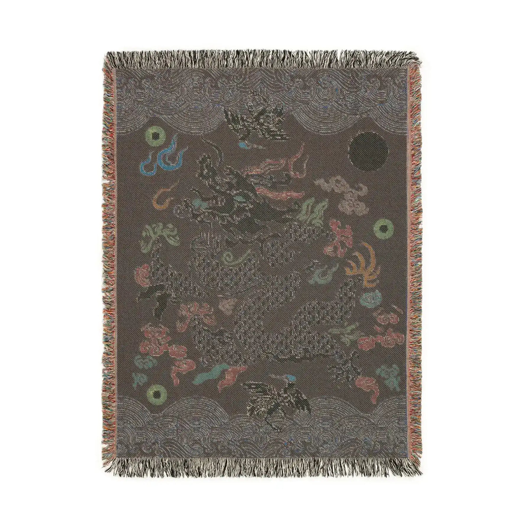 This woven blanket features an abstract design with bold, contrasting colors. The pattern includes large sunburst shapes in black and beige, interspersed with striking red geometric elements. The dynamic interplay of lines and shapes creates a visually stimulating and modern aesthetic, making it a unique and eye-catching piece for any home decor.