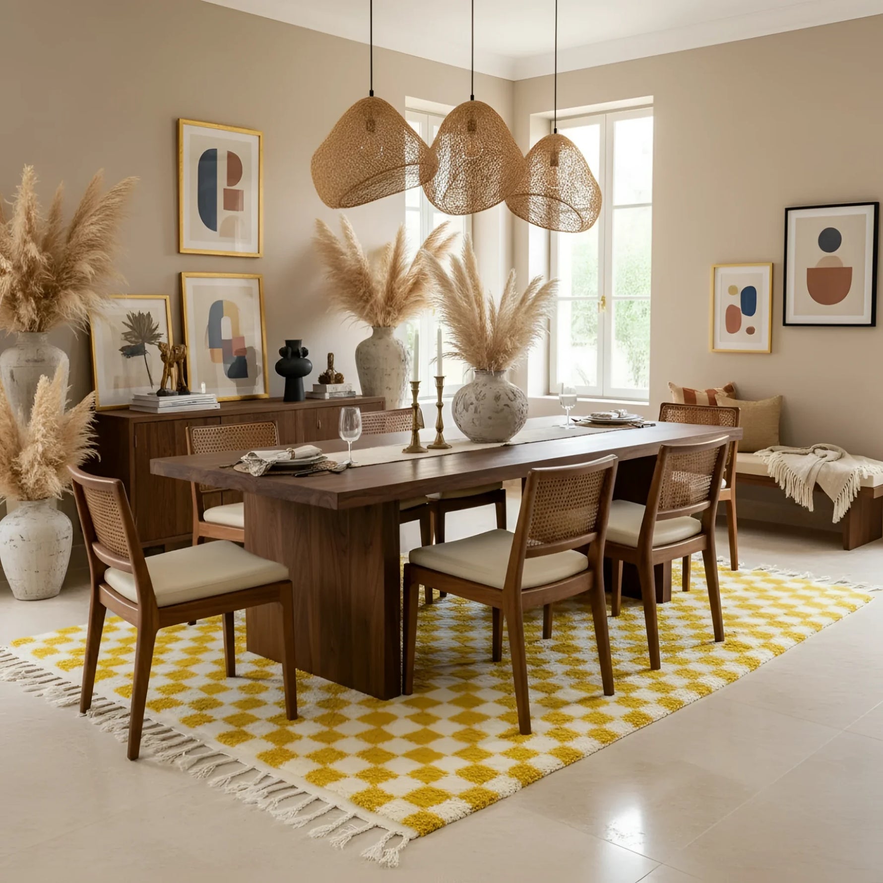 This beautiful wool rug was made by hand by Berber women in Morocco's High Atlas Mountains. It will add a classic touch to your home. It's made totally by hand from pure Moroccan wool and has a standard yellow and white checker pattern that was inspired by tribal patterns. For cozy, classy rooms, it's great because it's soft, long-lasting, and full of history.