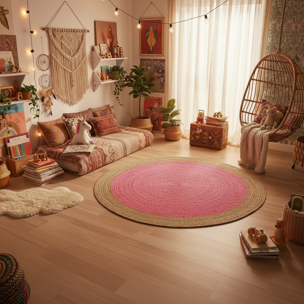 This Natural Bordered Bright Pink Round Jute Rug is safe for kids and pets, so it can go in places with a lot of foot traffic, like the living room, dining room, kitchen, office, and entryway.