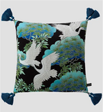 This exquisite cushion cover features a dramatic design on a sophisticated black background, where graceful white cranes—symbols of longevity and good fortune—are depicted amidst lush pine trees with vibrant blue and green foliage, evoking the serenity of a moonlit garden. Crafted from 100% polyester, it offers a soft, luxurious feel with exceptional durability, making it a statement piece that brings elegant, nature-inspired artistry to your home decor.