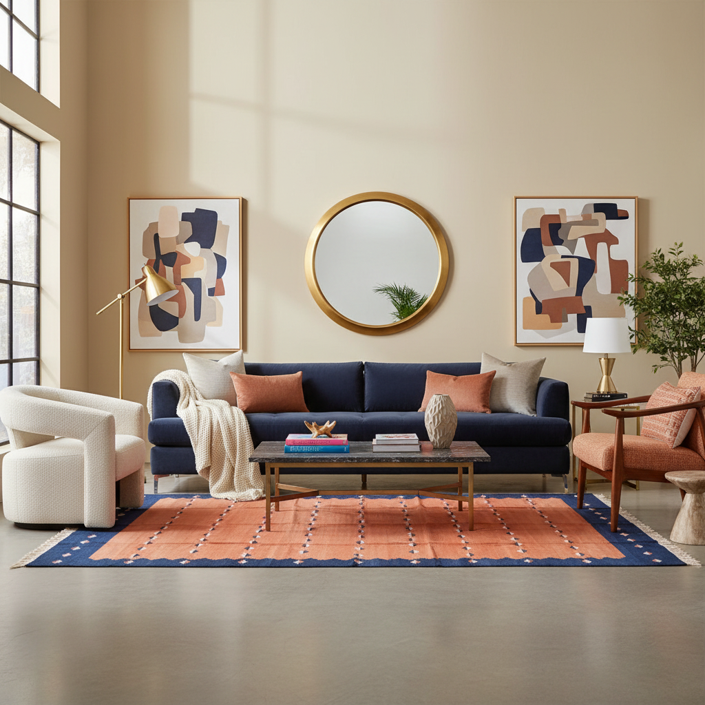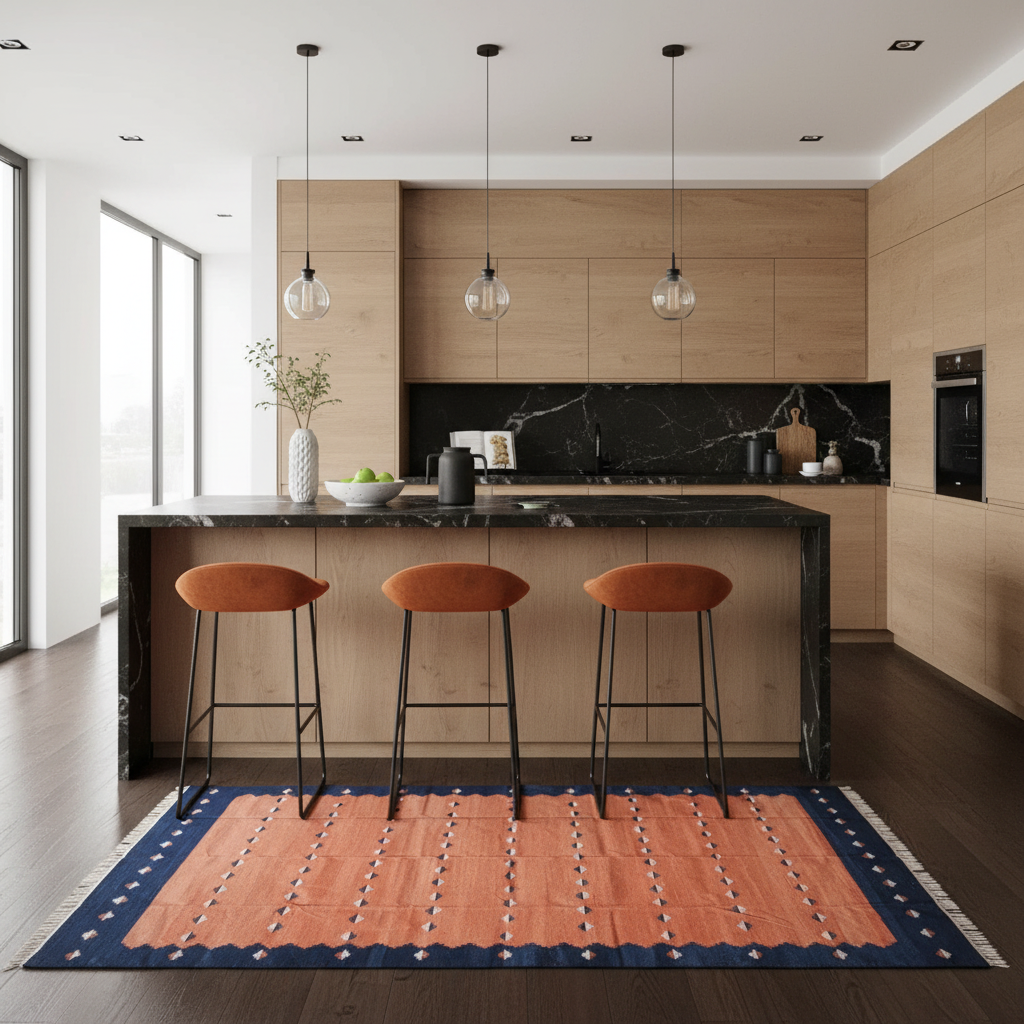 The Indian Dhurrie Reversible Burnt Orange Organic Vegetable-Dyed Cotton Rug is a work of art that was made by hand using both traditional Indian weaving techniques and eco-friendly techniques. This rug is bright and good for the environment because it is made of 100% cotton and was colored with natural vegetable dyes. Because it can be turned around, it's very flexible and makes it easy to change how a room looks. It's great for living rooms, bedrooms, and even patios outside because the deep burnt orange color makes any space feel warm and welcoming. While this dhurrie rug is made to last, its classic style makes it more than just a floor covering. It's a work of art that will make your home look better.