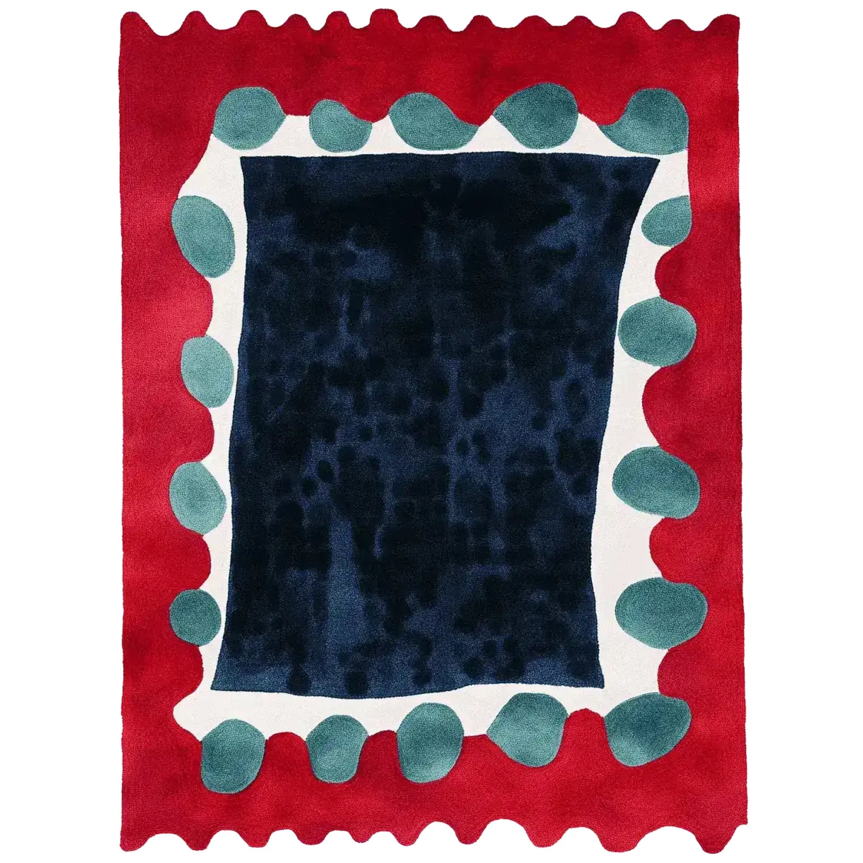 Available in a variety of sizes from intimate 3' x 5' to expansive 12' x 15', this rug effortlessly fits into any space. The contemporary design, characterized by a pebbled frame, comes alive in mesmerizing hues of blue and red, instantly enhancing any room's aesthetic.