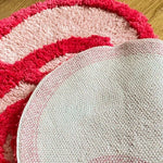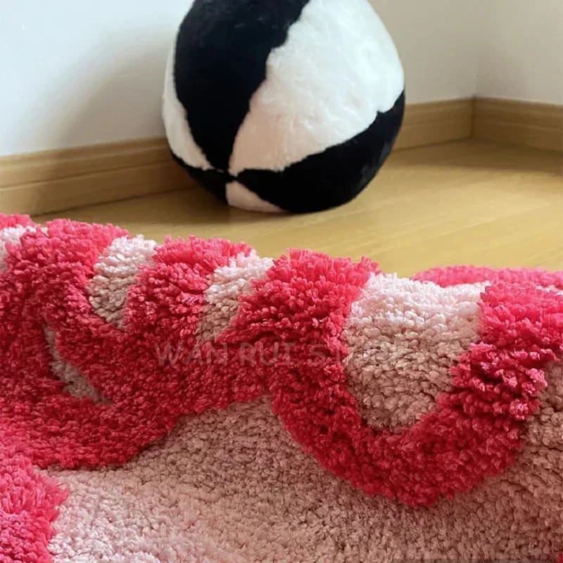 A sweet and playful bath mat featuring the word "Love" in a bold, cursive font. This plush mat is designed with shades of pink and red, making it a vibrant addition to any bathroom.