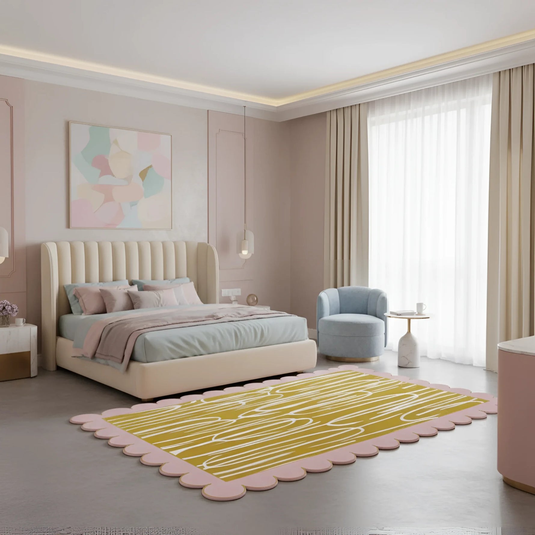This rug changes what it means to be luxurious by combining soft comfort with show-stopping style. It has modern art on it and scalloped edges. Every thread is a work of art on its own, but when put together, they create a beautiful floor covering and an unusually high level of art. Show that you like one-of-a-kind items by making this beautiful rug the focal point of your room. The Pink Scalloped Contemporary Art Hand Tufted Rug is the perfect way to add style to your home. Really amazing! You can make your home look more stylish with the Pink Scalloped Contemporary Art Hand Tufted Rug, which is the essence of modern elegance.