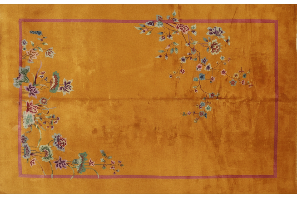 Red Bordered Spring Floral in the Golden Sky Wool Hand Knotted Area Rug