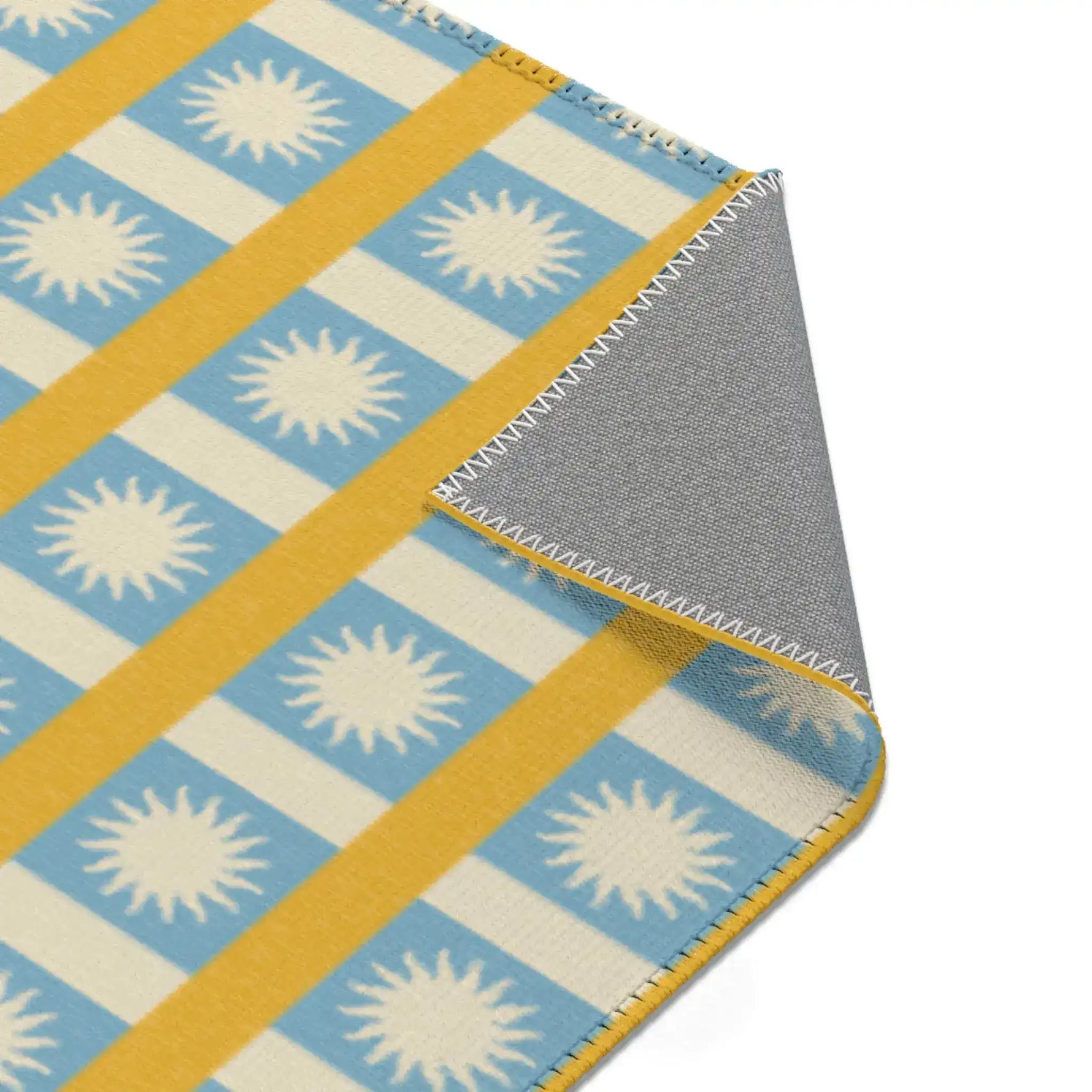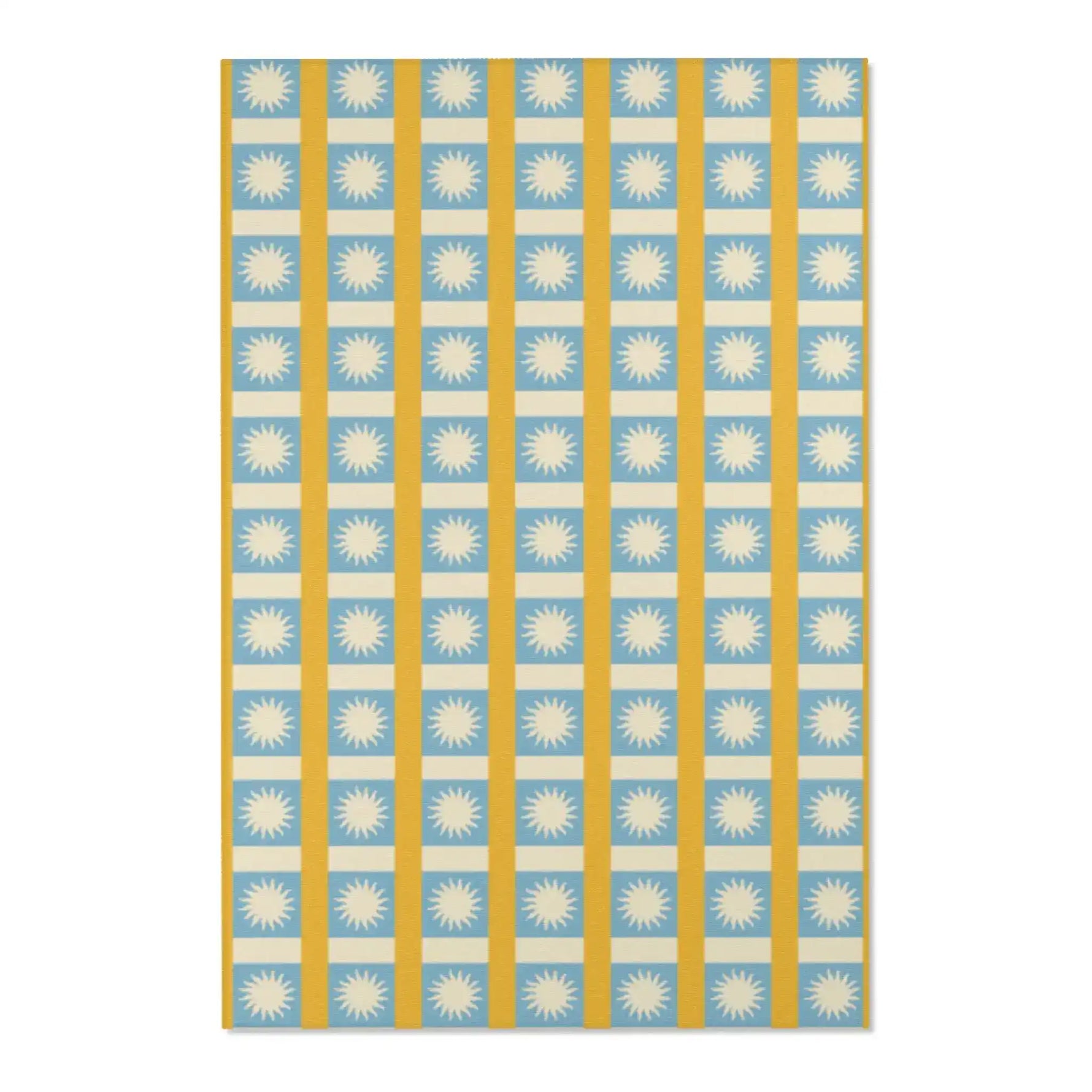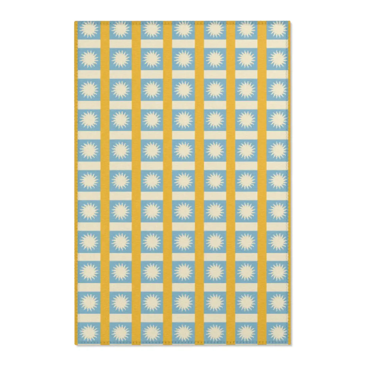 This accent rug features a bold, geometric sunburst design in black, red, and beige. The pattern radiates energy and vibrance, making it a striking addition to any room. The contrasting colors and dynamic shapes create a visually captivating piece that effortlessly enhances modern and artistic home decor.