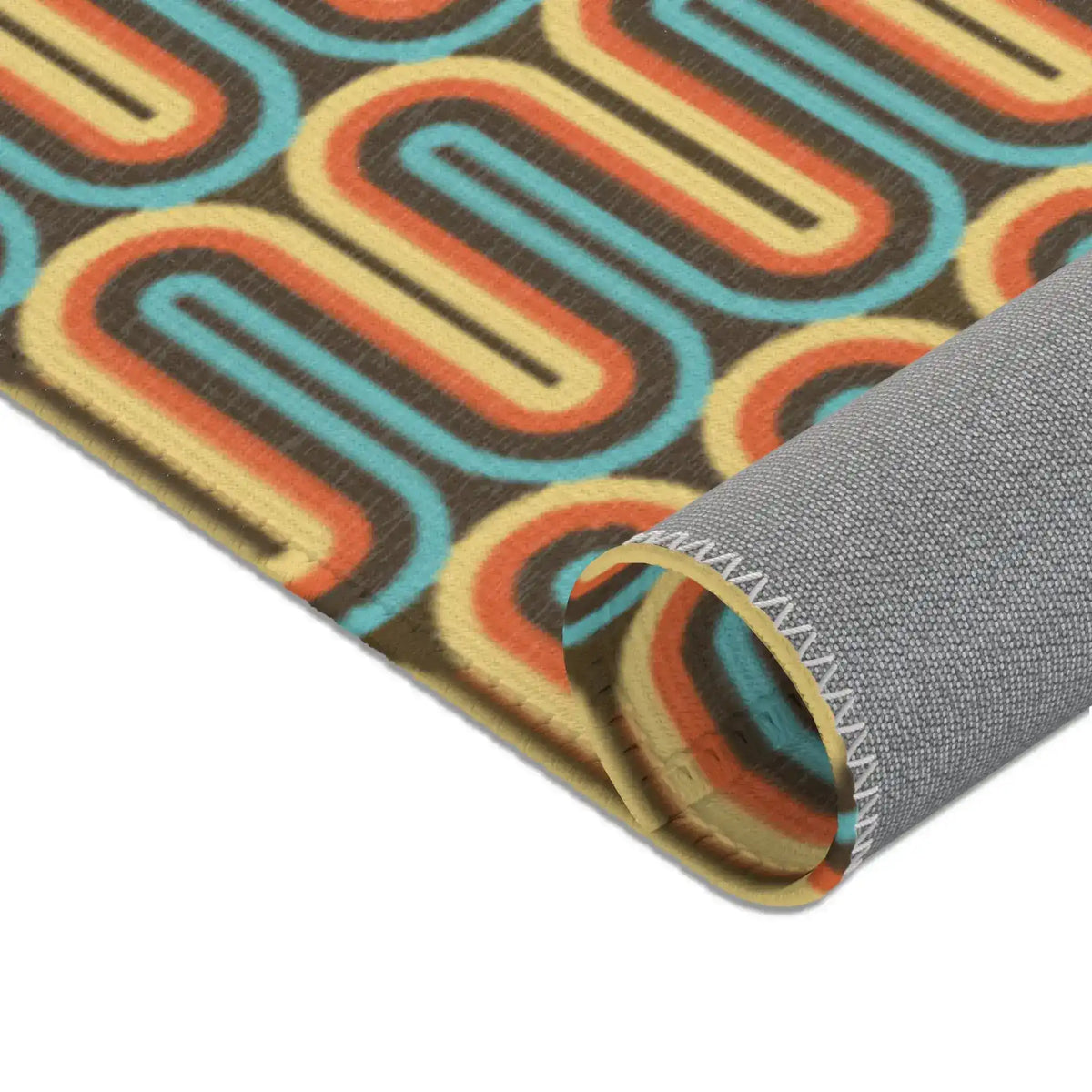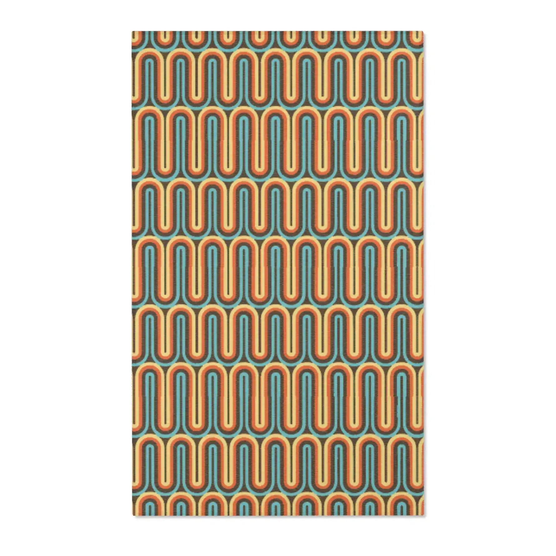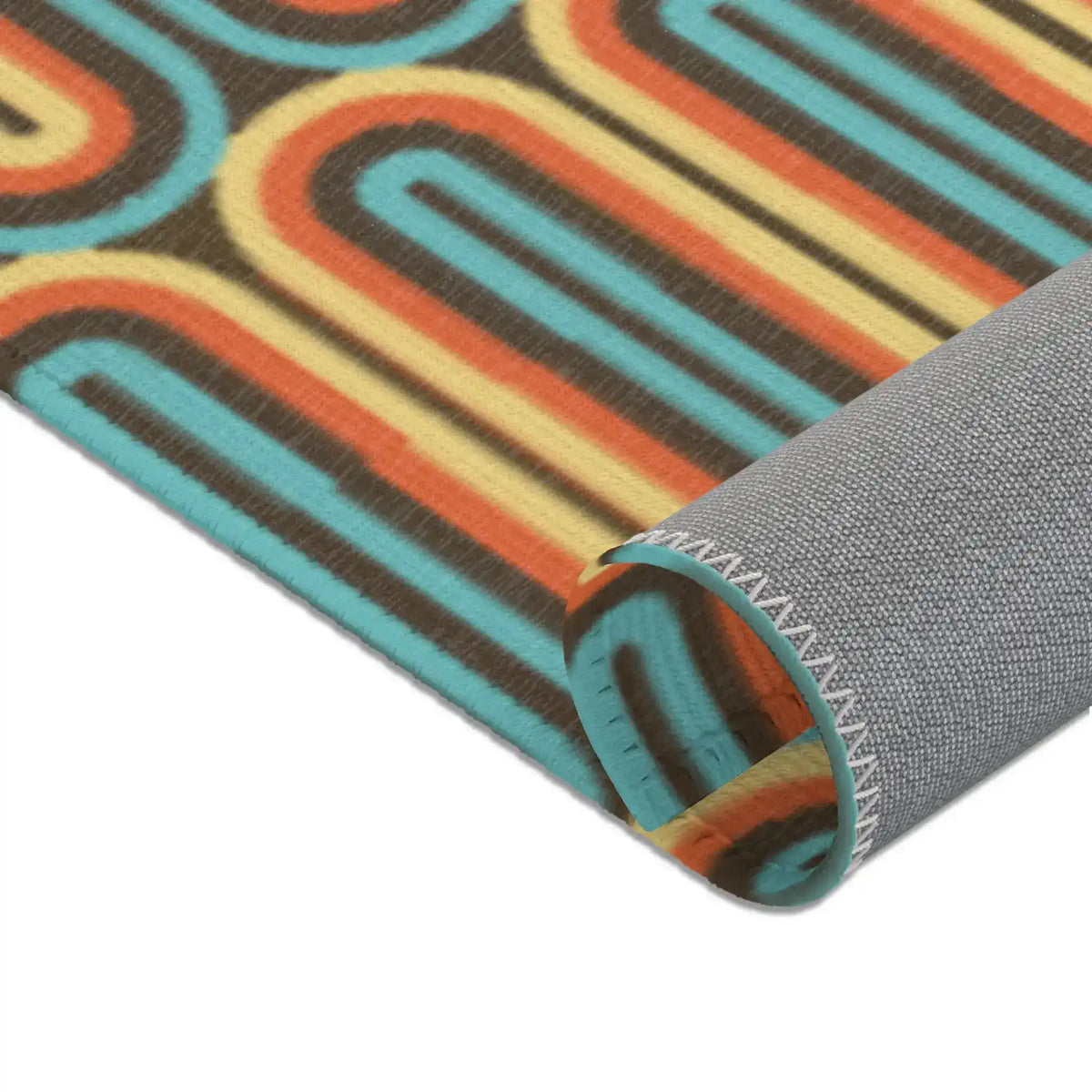 This accent rug features a bold, geometric sunburst design in black, red, and beige. The pattern radiates energy and vibrance, making it a striking addition to any room. The contrasting colors and dynamic shapes create a visually captivating piece that effortlessly enhances modern and artistic home decor.