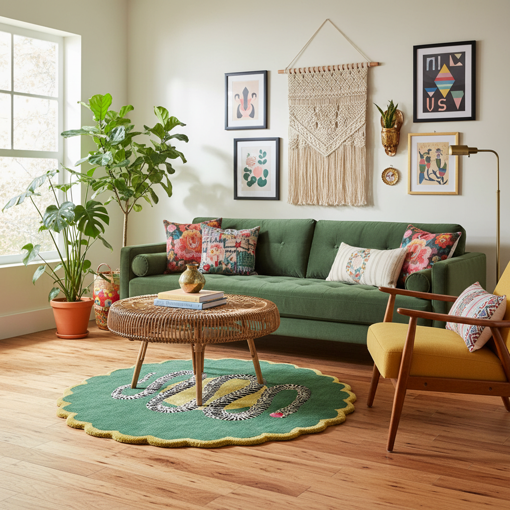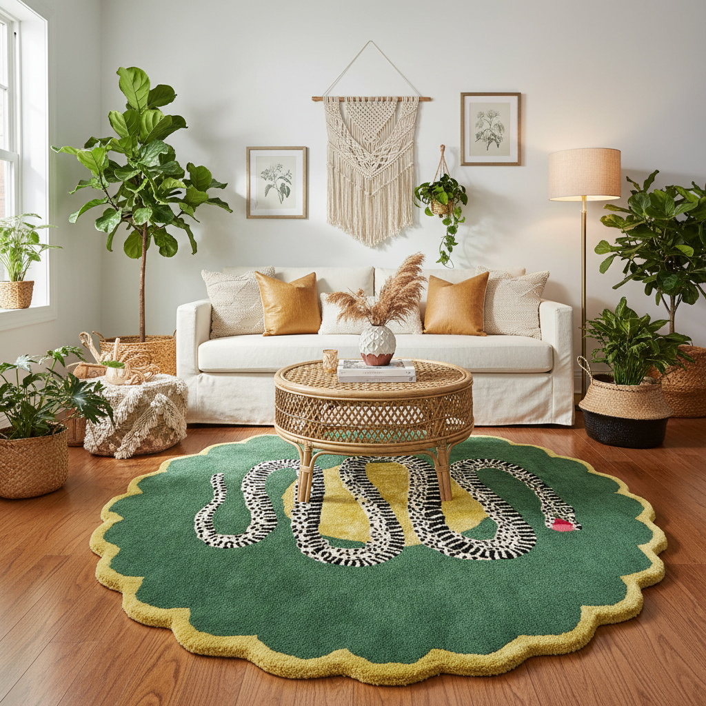 With the Scalloped Green Snake and Apple Round Hand Tufted Wool Rug, you can add a touch of fun and natural beauty to your room. This rug is meant to stand out. It has bright green colors and funky details that give it a unique artistic look that will look great in any modern or bohemian home. Its soft, rich hand-tufted wool makes it feel good underfoot and makes it last for a long time.