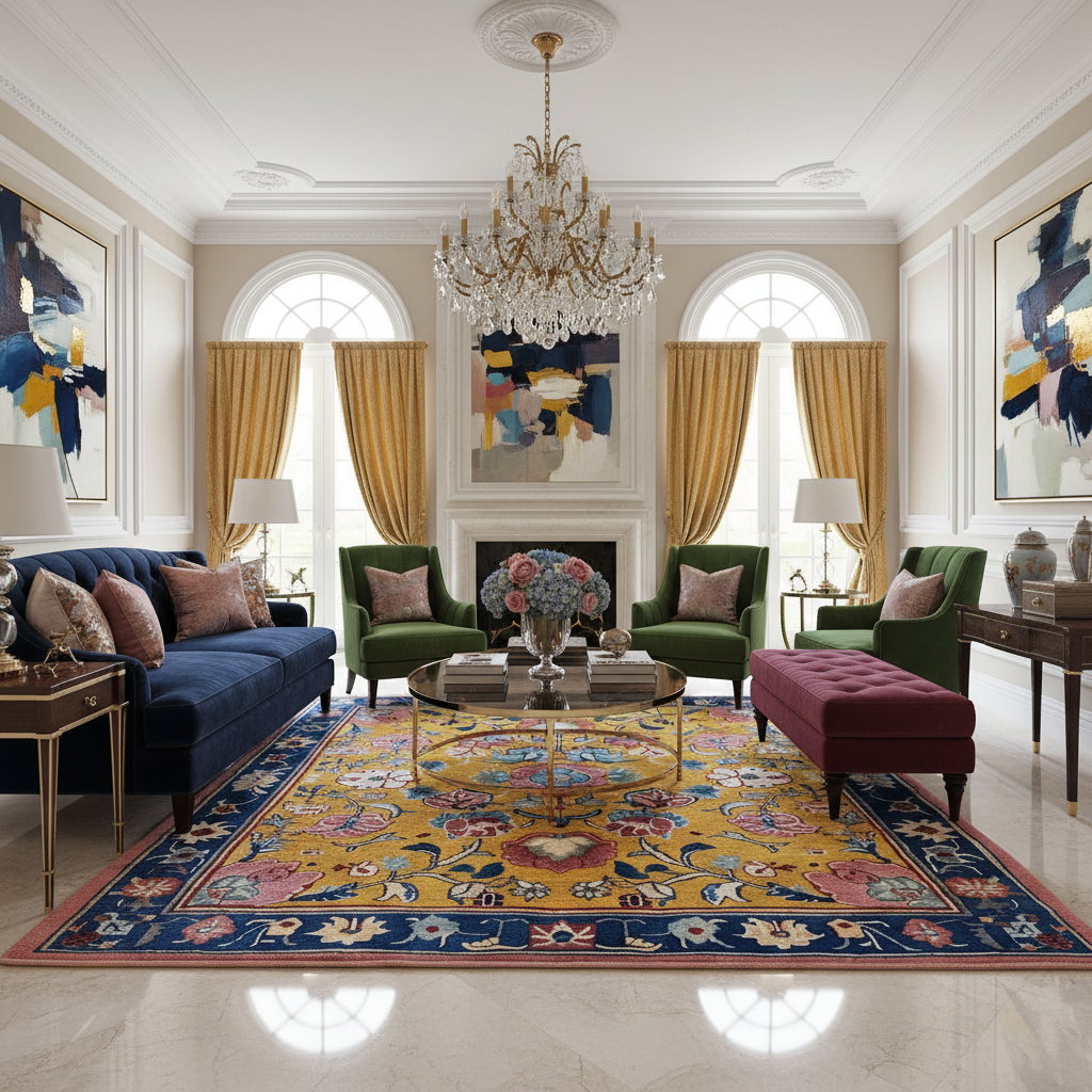 This vibrant Sunlit Floral Symphony Hand Tufted Wool Rug features an intricate floral design with rich colors. Ideal for large living room spaces, this 8x10 area rug adds a touch of elegance and warmth. The wool material ensures durability and a soft touch, making it a perfect floral rug choice for any living room.