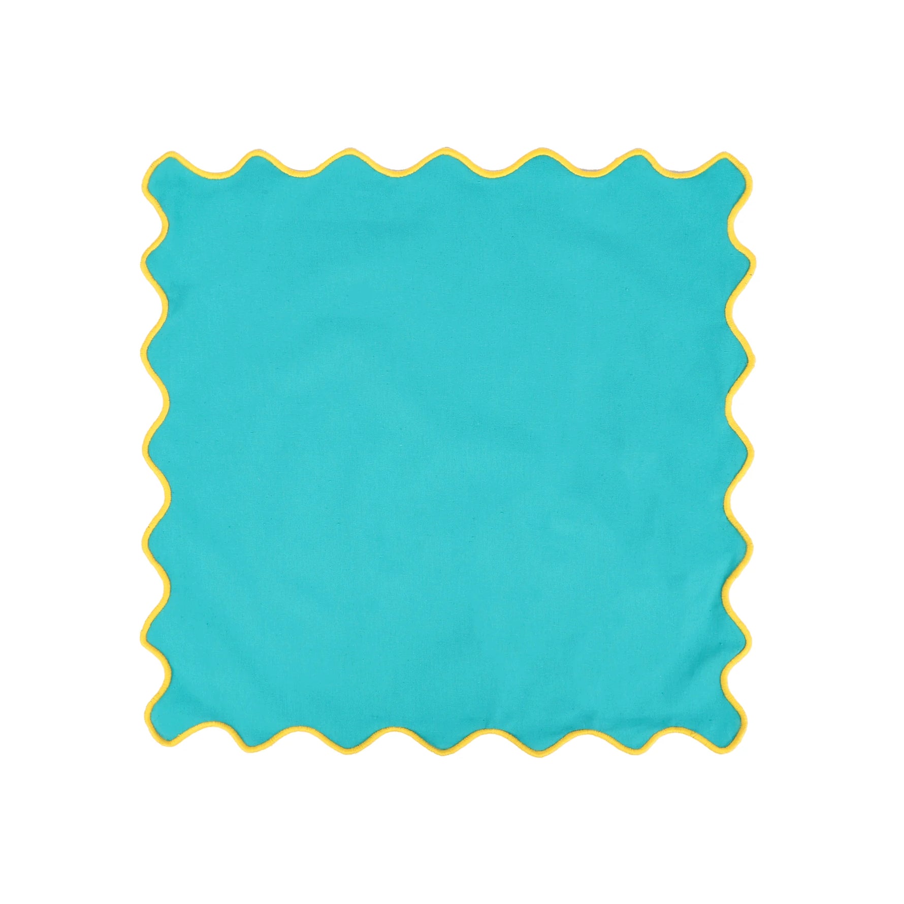 Add a touch of playful luxury to your table with our Scalloped Serenity placemat. Crafted from 100% cotton, this beautiful teal placemat features a unique, scalloped edge in a contrasting marigold yellow, bringing a pop of vibrant color to any dining setting.