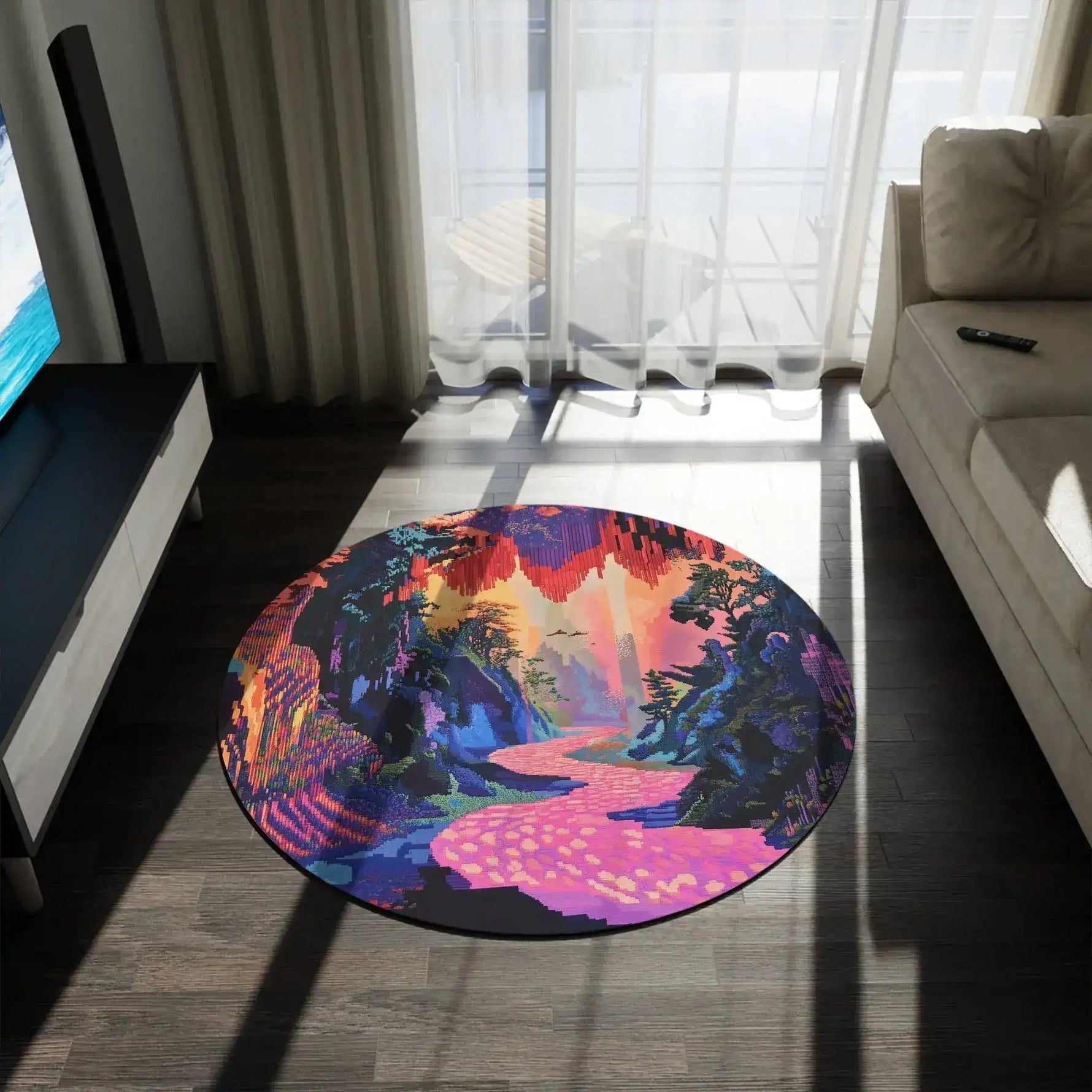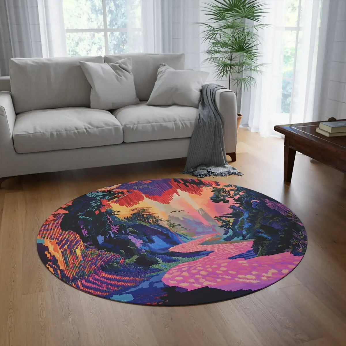 Vibrant Pixelated Landscape Round Rug