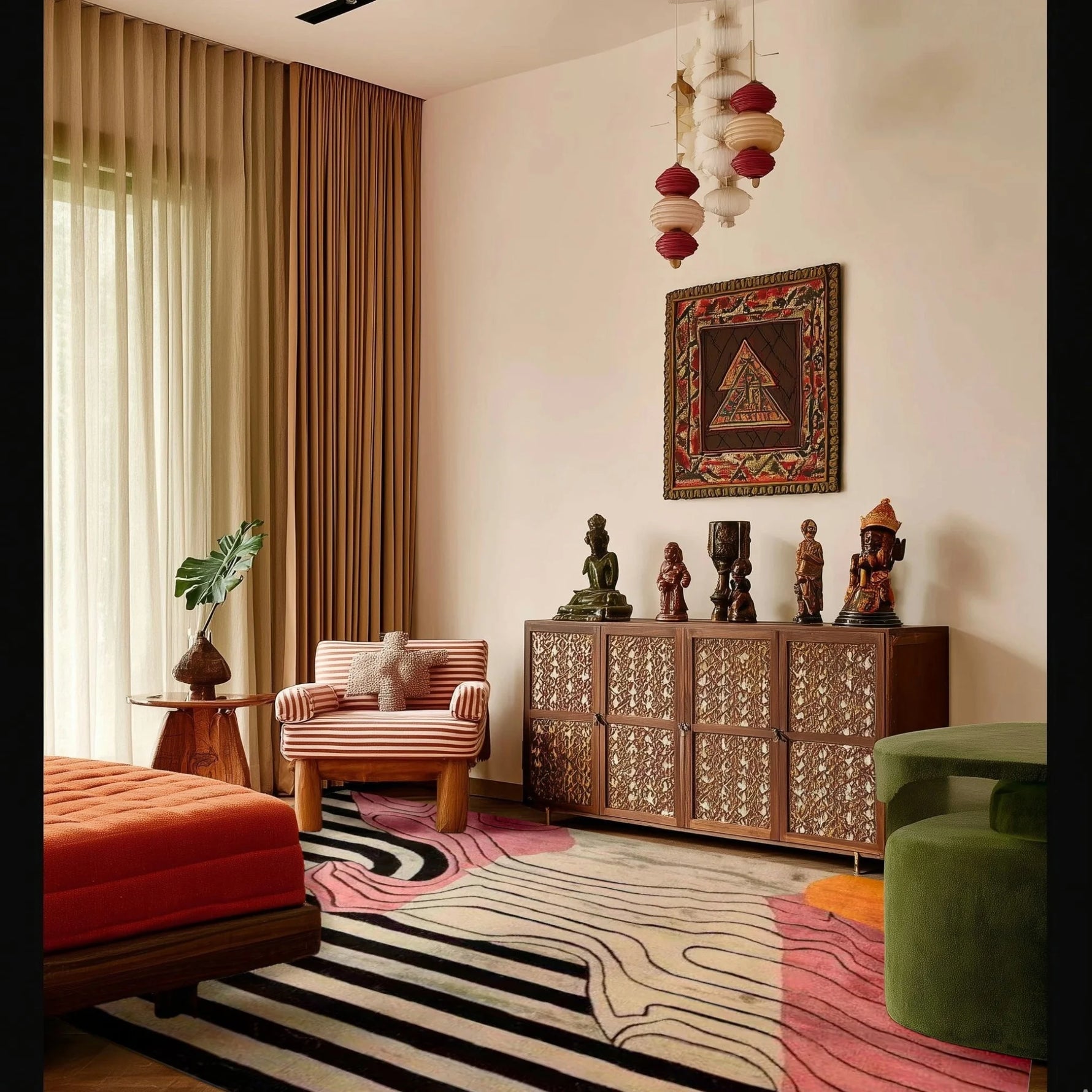 The only rug that resembles it is the Vivid Shapes Hand-Tufted Viscose Rug. Its straight lines and brightness make it easy to locate. This rug feels soft and lasts a long time because of its soft viscose. Its exquisite design adds a touch of modern art to any space.