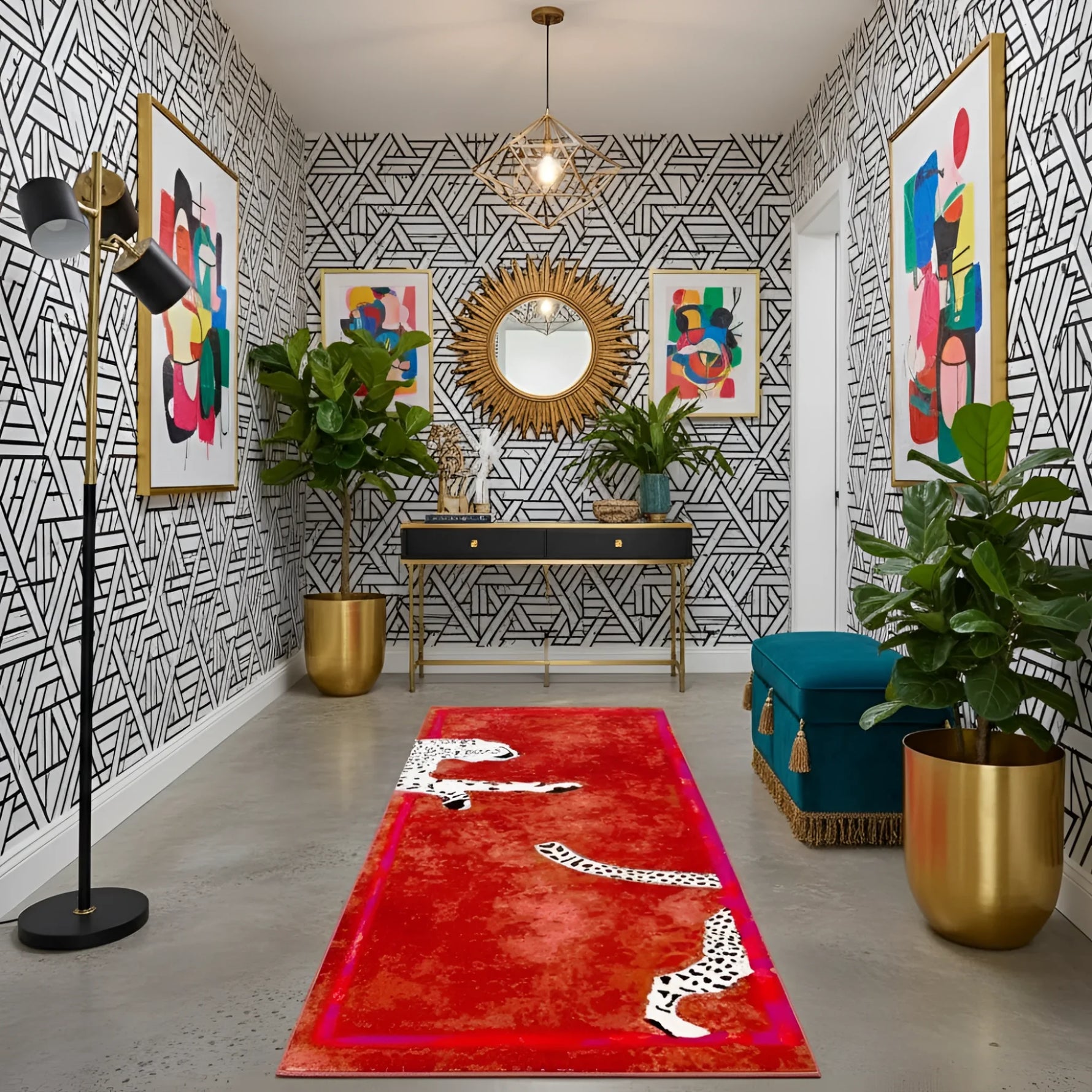 Walking Wild Cat Leopard on Silk Road Hand Tufted Wool Rug - Red