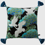 This luxurious cushion cover showcases two elegant white cranes in mid-flight, their graceful forms standing out against a deep black background. The design is complemented by stylized blue and green foliage, reminiscent of traditional Japanese art. This beautiful piece adds a serene and sophisticated touch to any home, symbolizing good fortune and longevity.