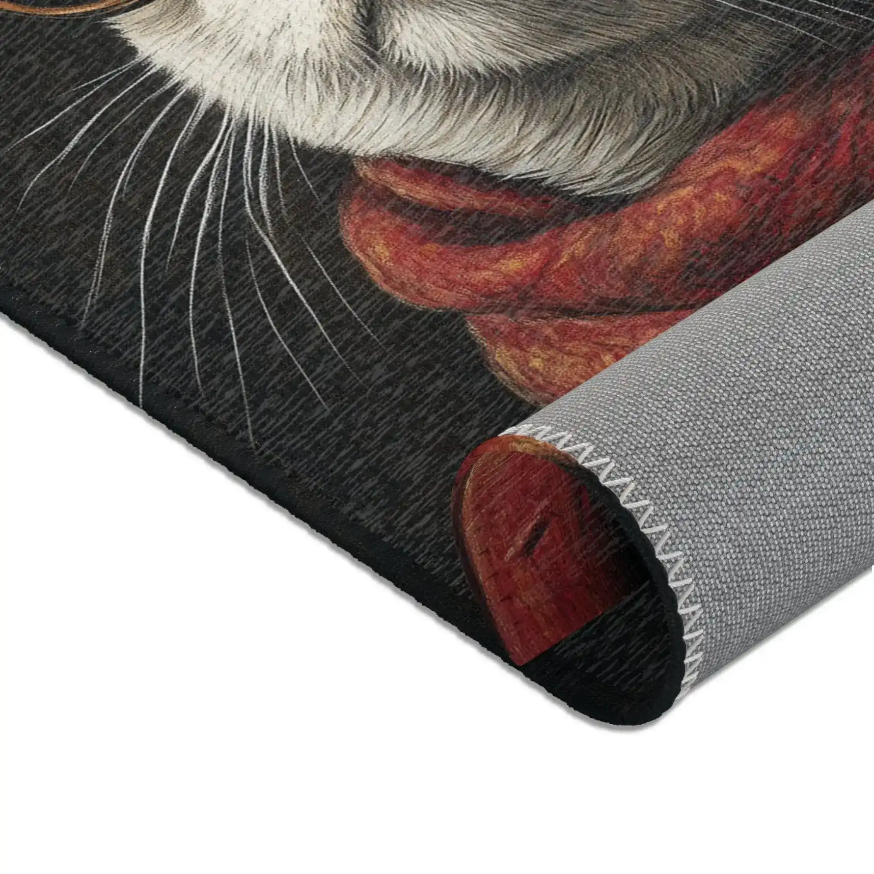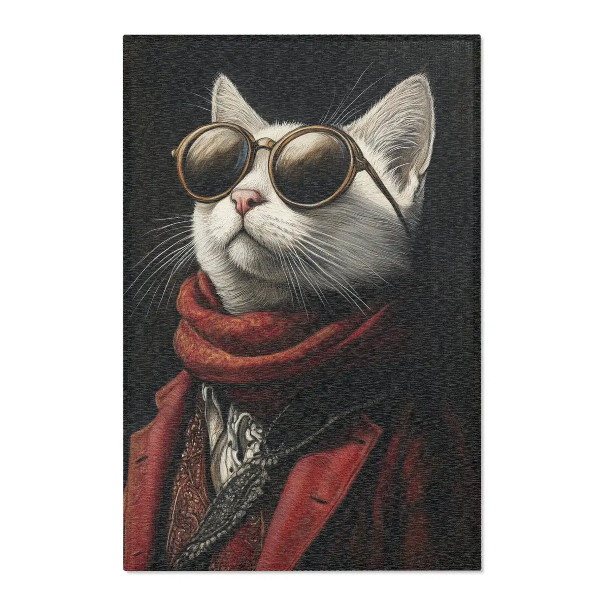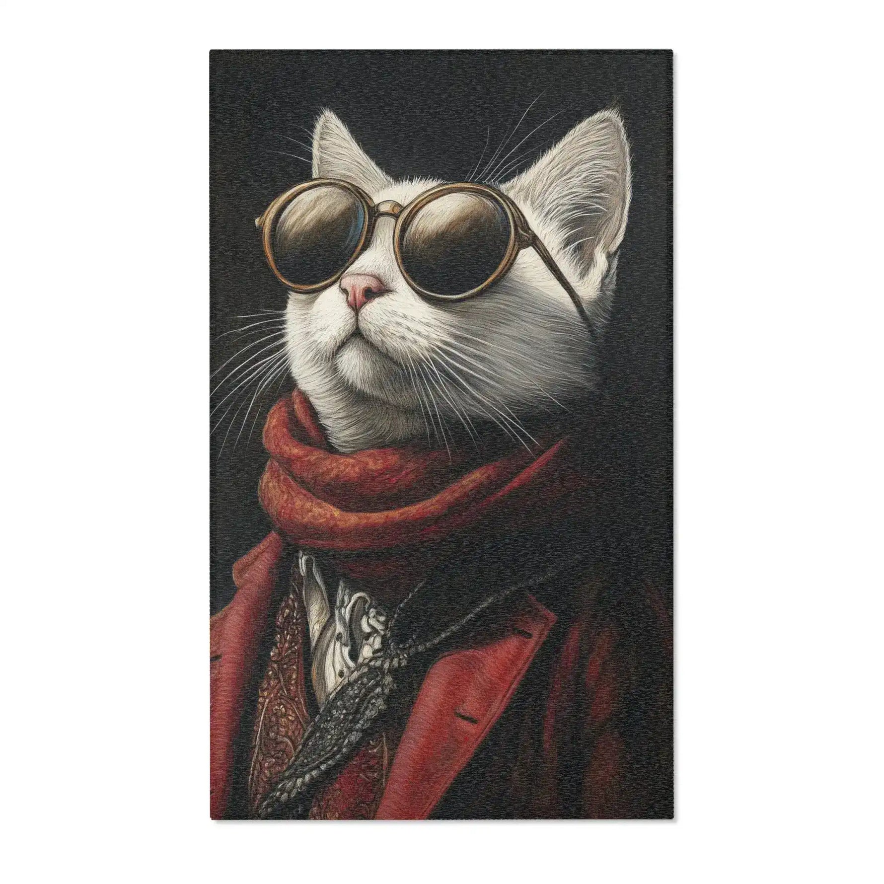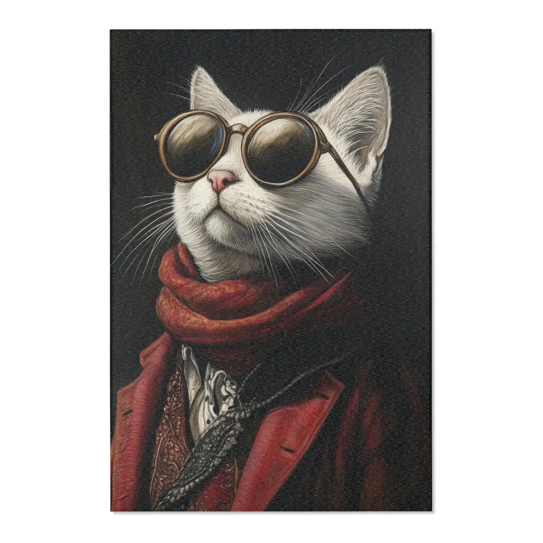 You can add some fun and style to your home with a stylish floor rug that has a cat wearing sunglasses and clothes that look old. This is just the right amount of fun and class for any place.