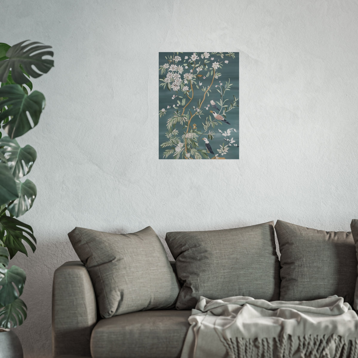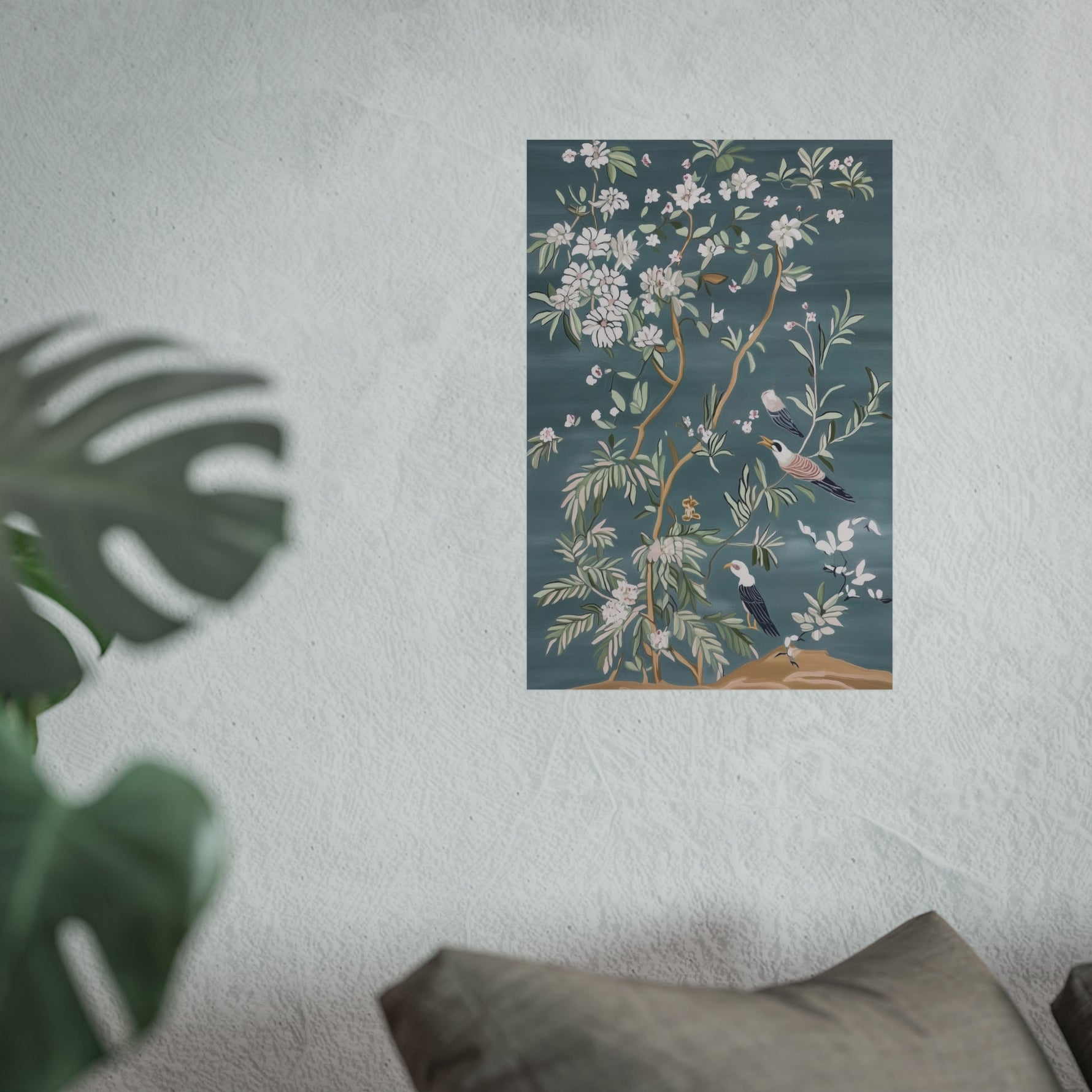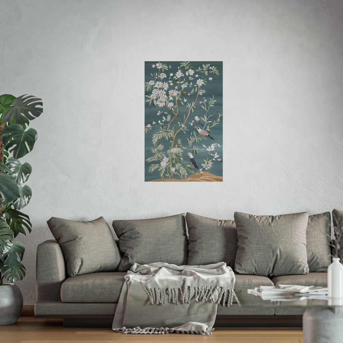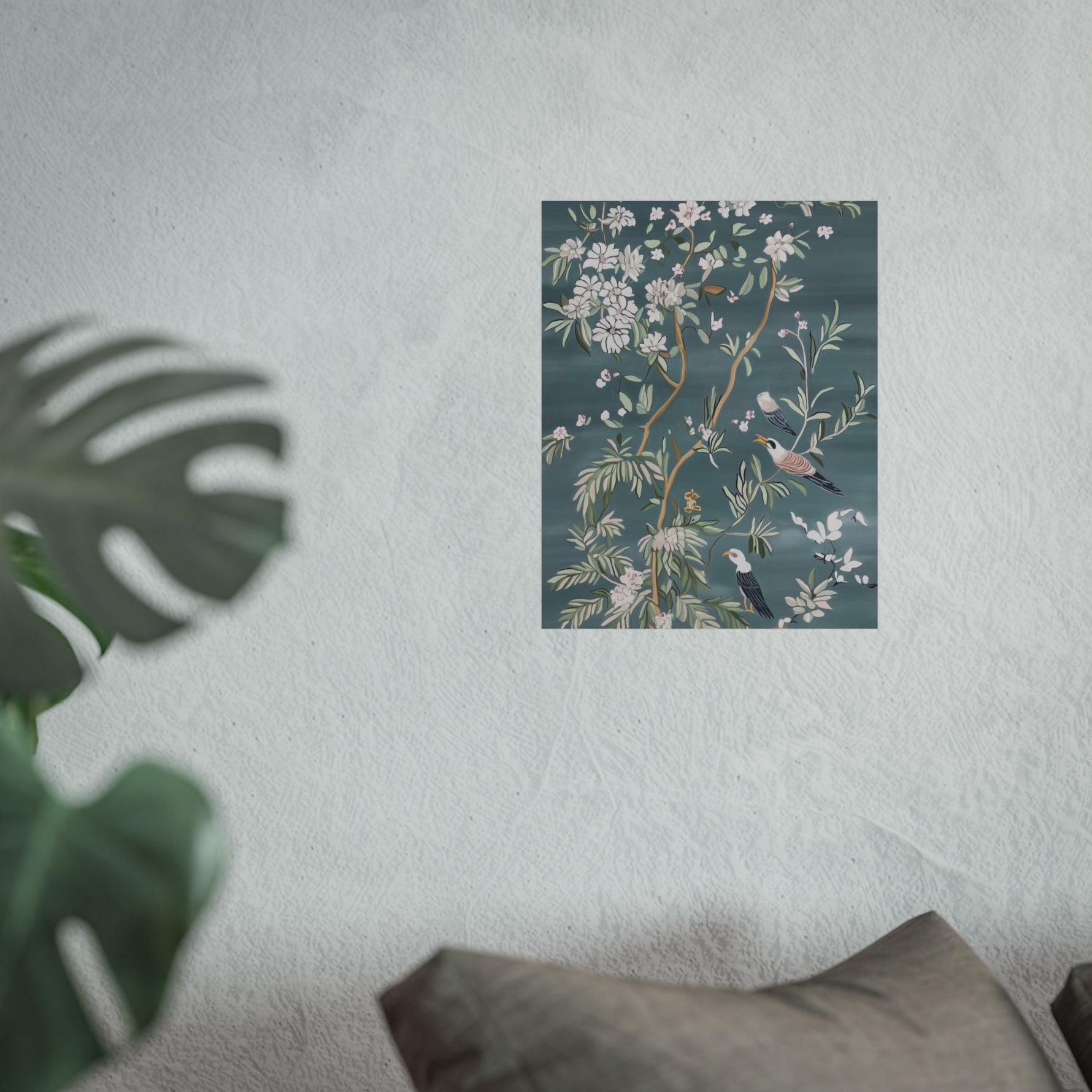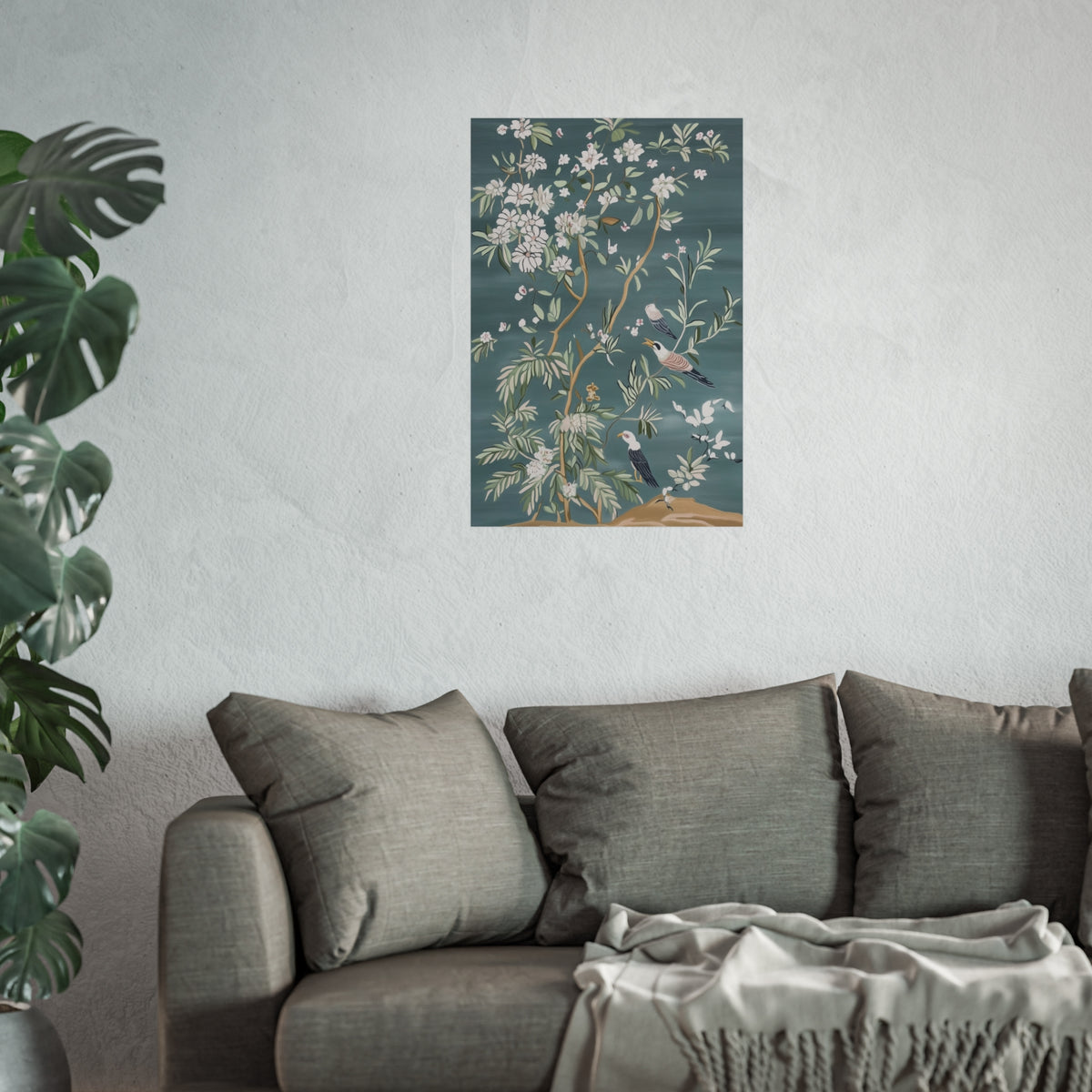 Dark Gray Chinoiserie Birds and Floral Scene Fine Art Poster