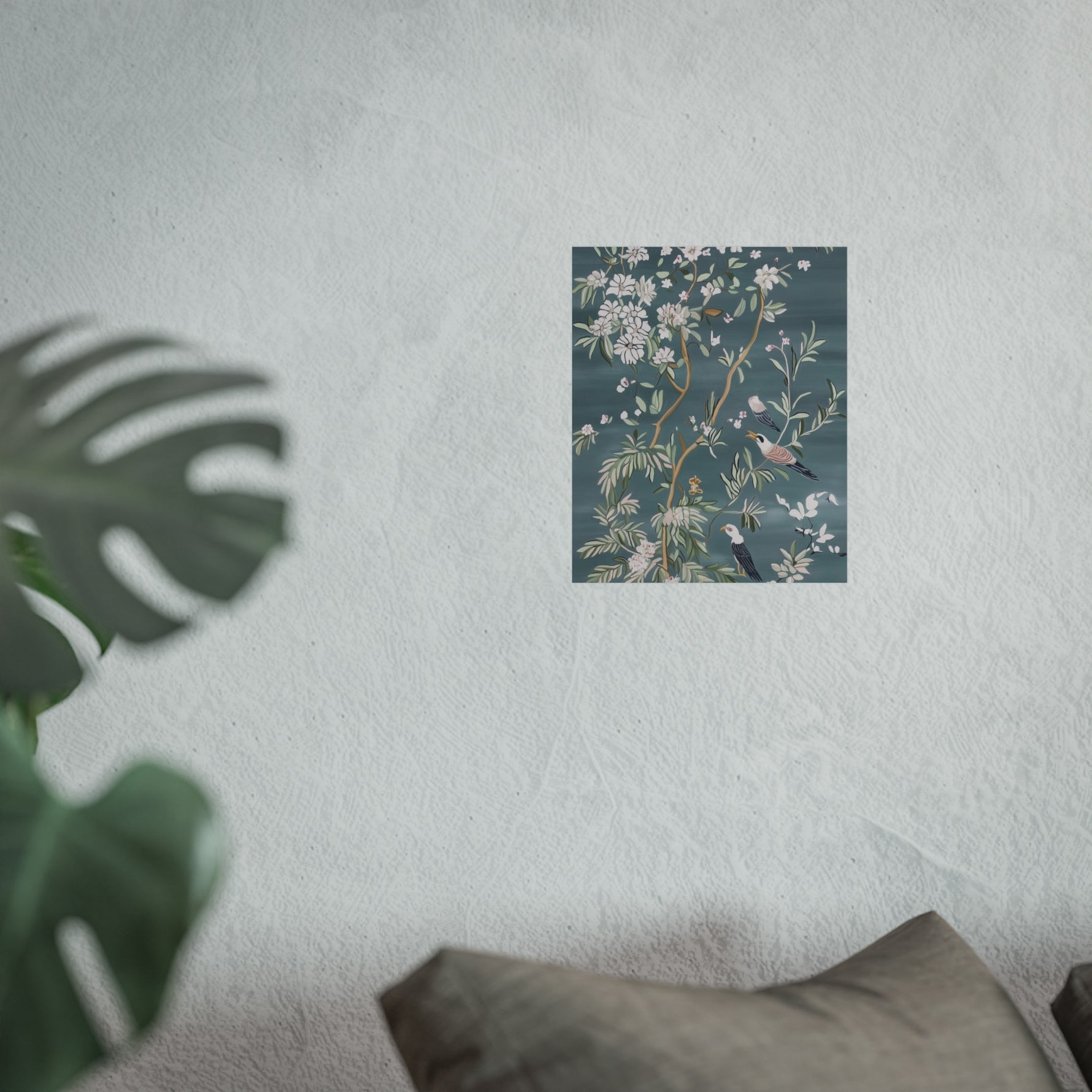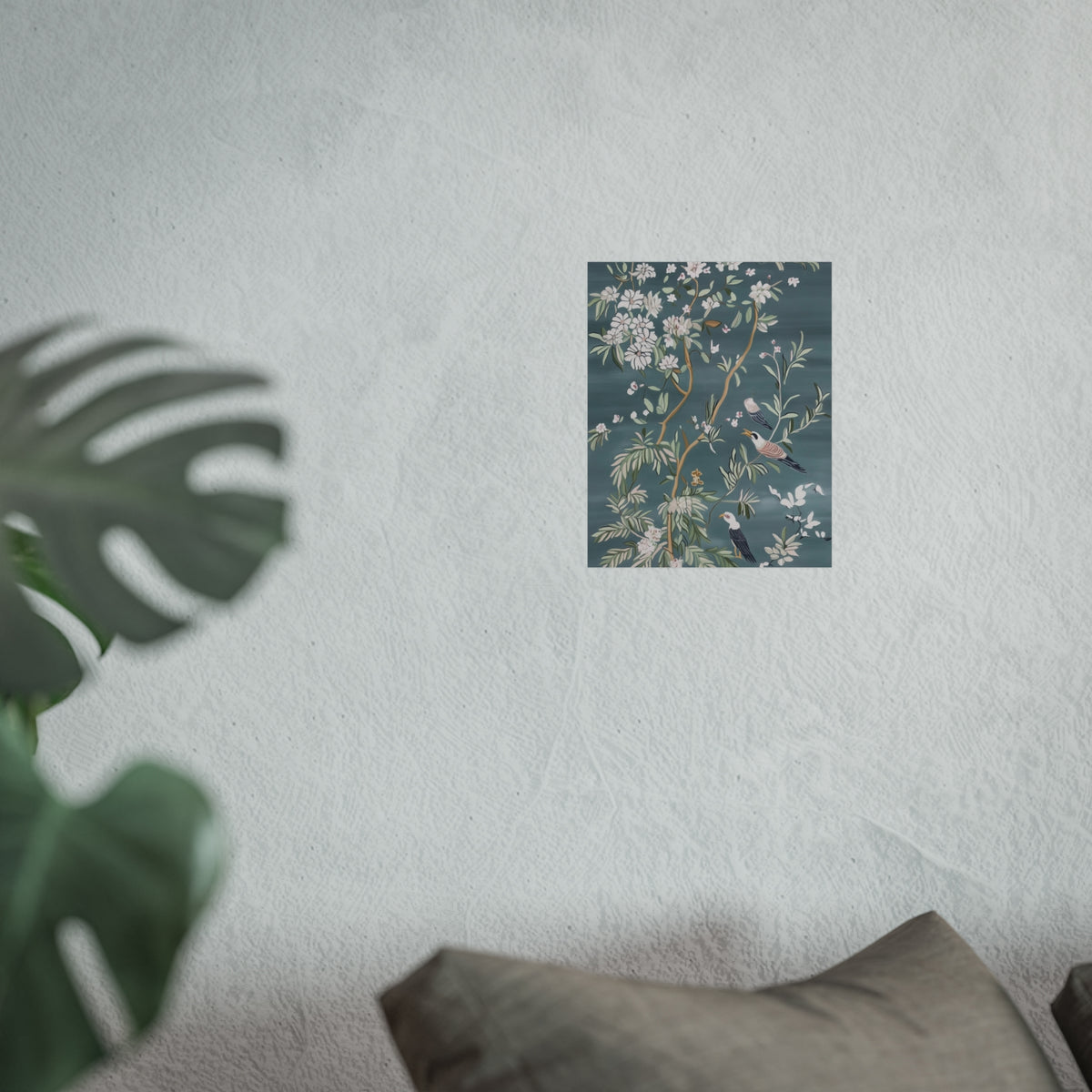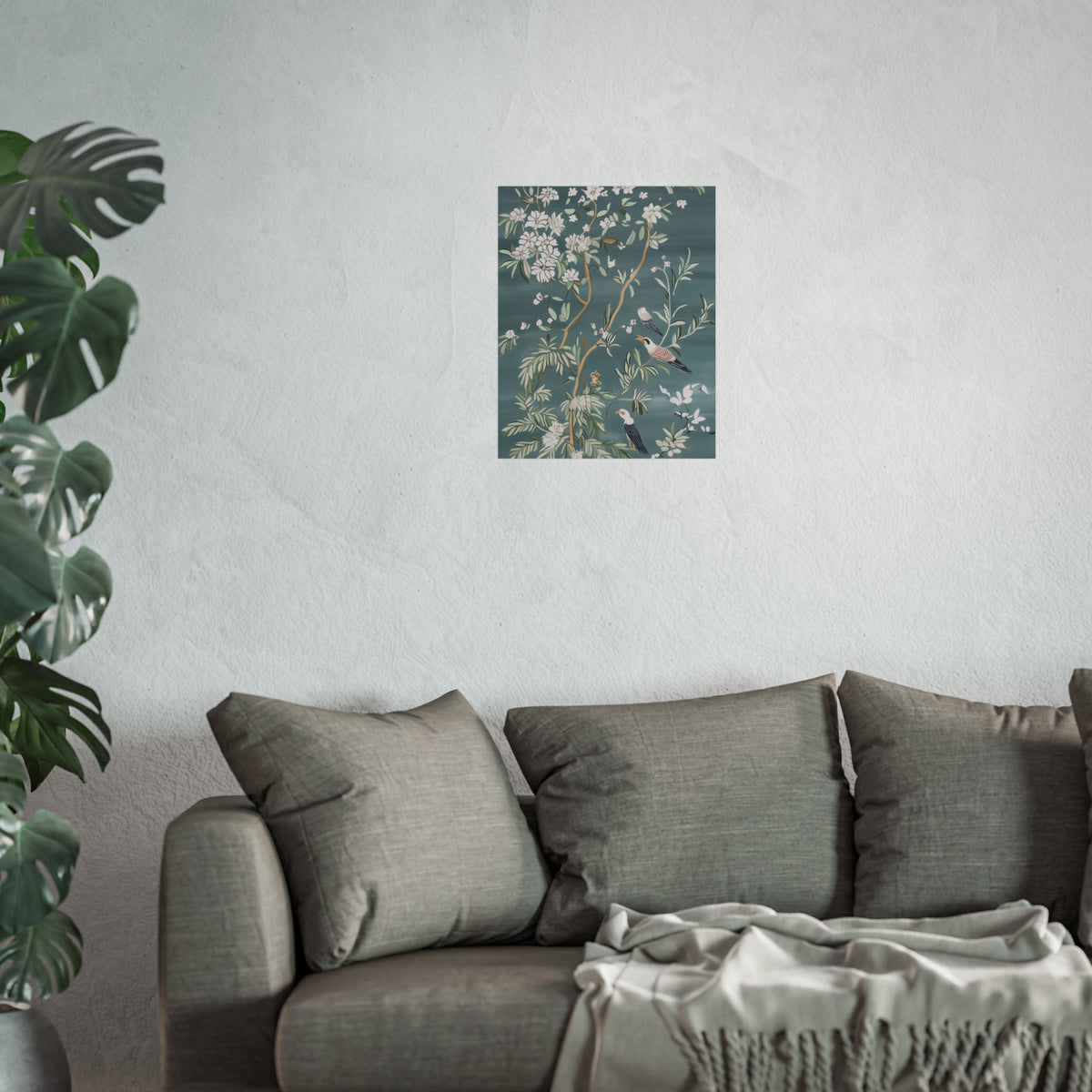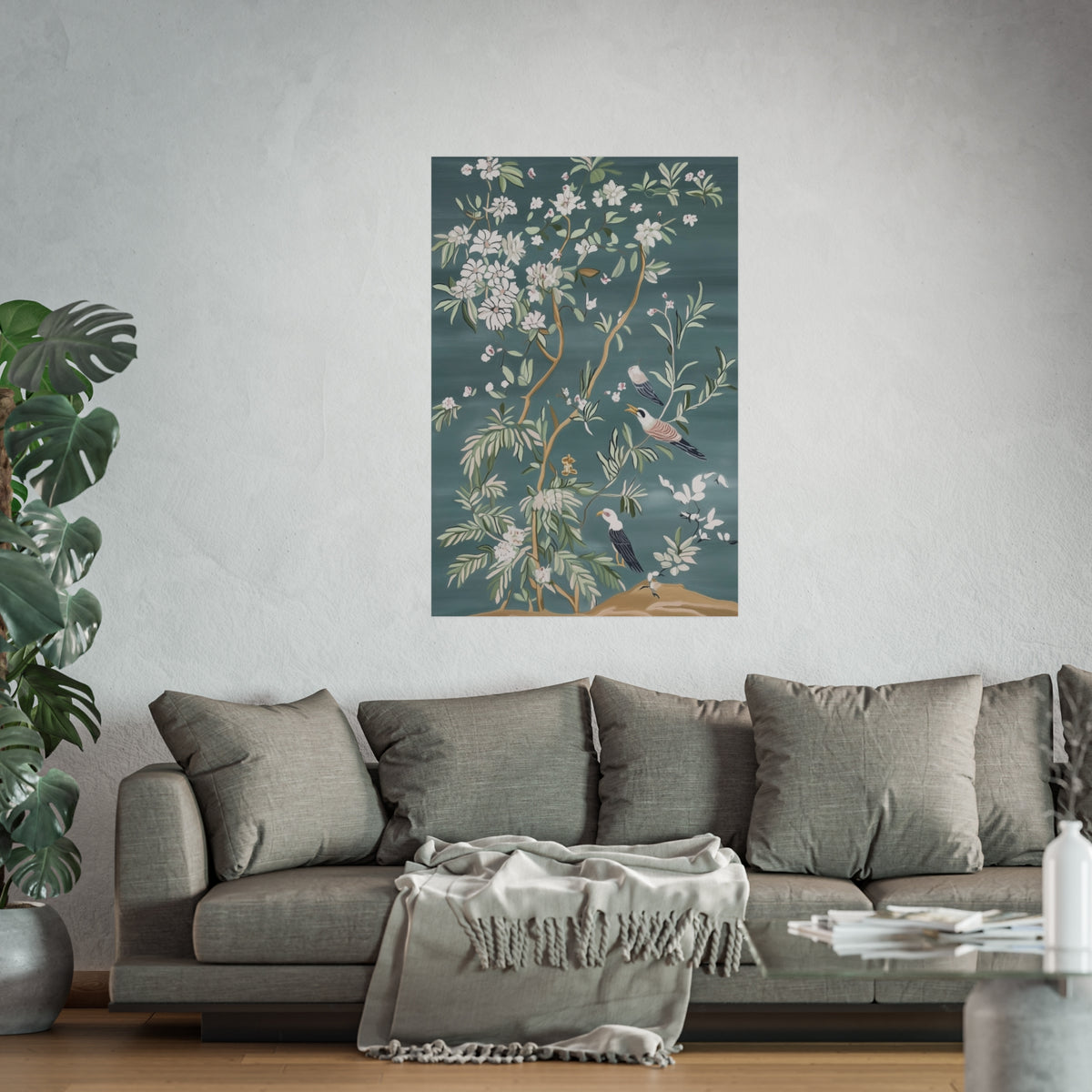 Dark Gray Chinoiserie Birds and Floral Scene Fine Art Poster