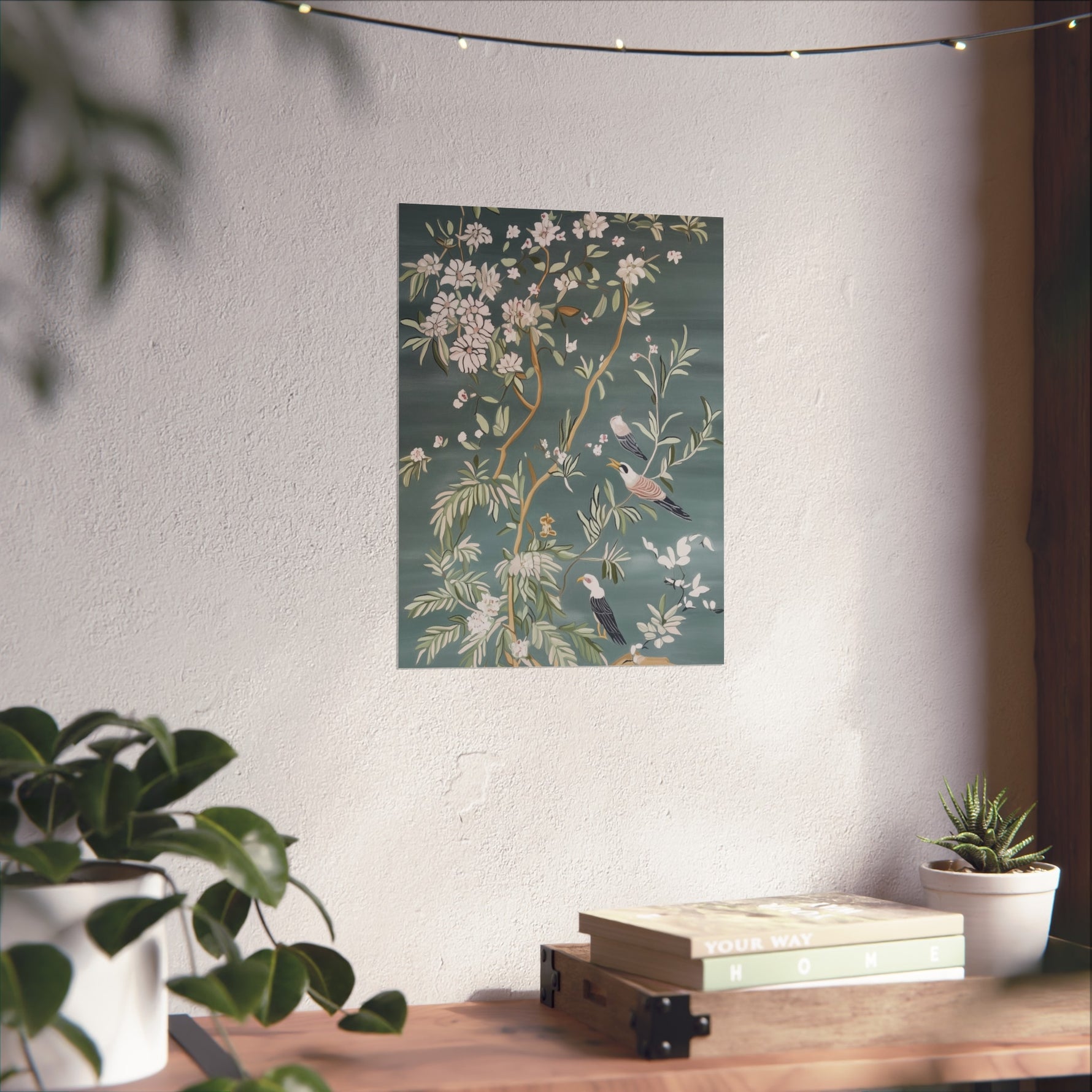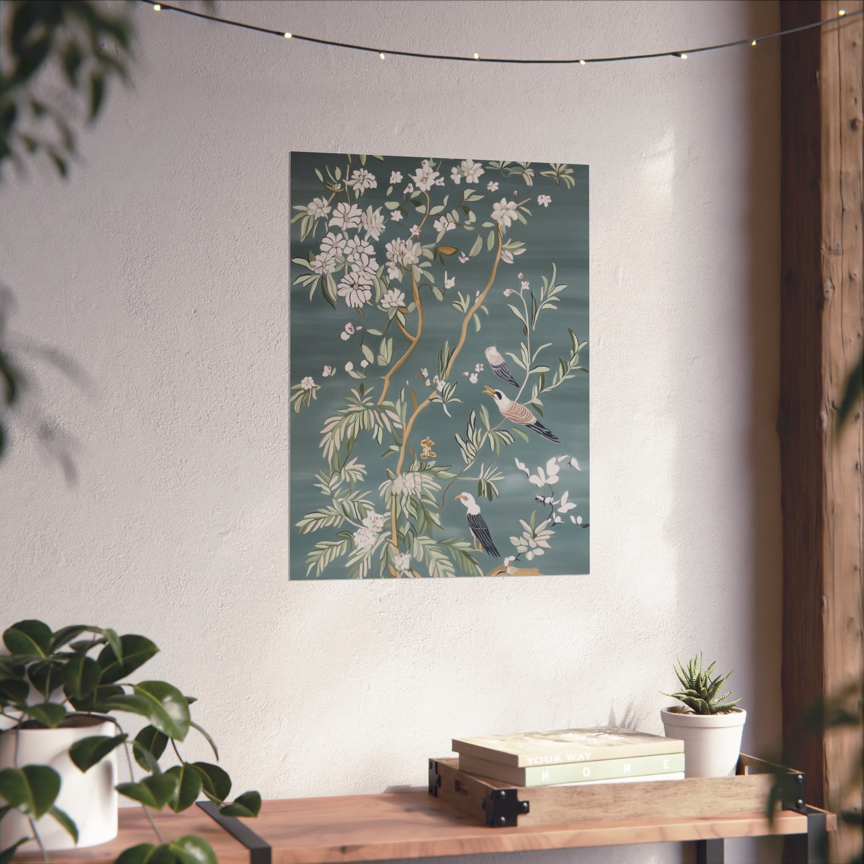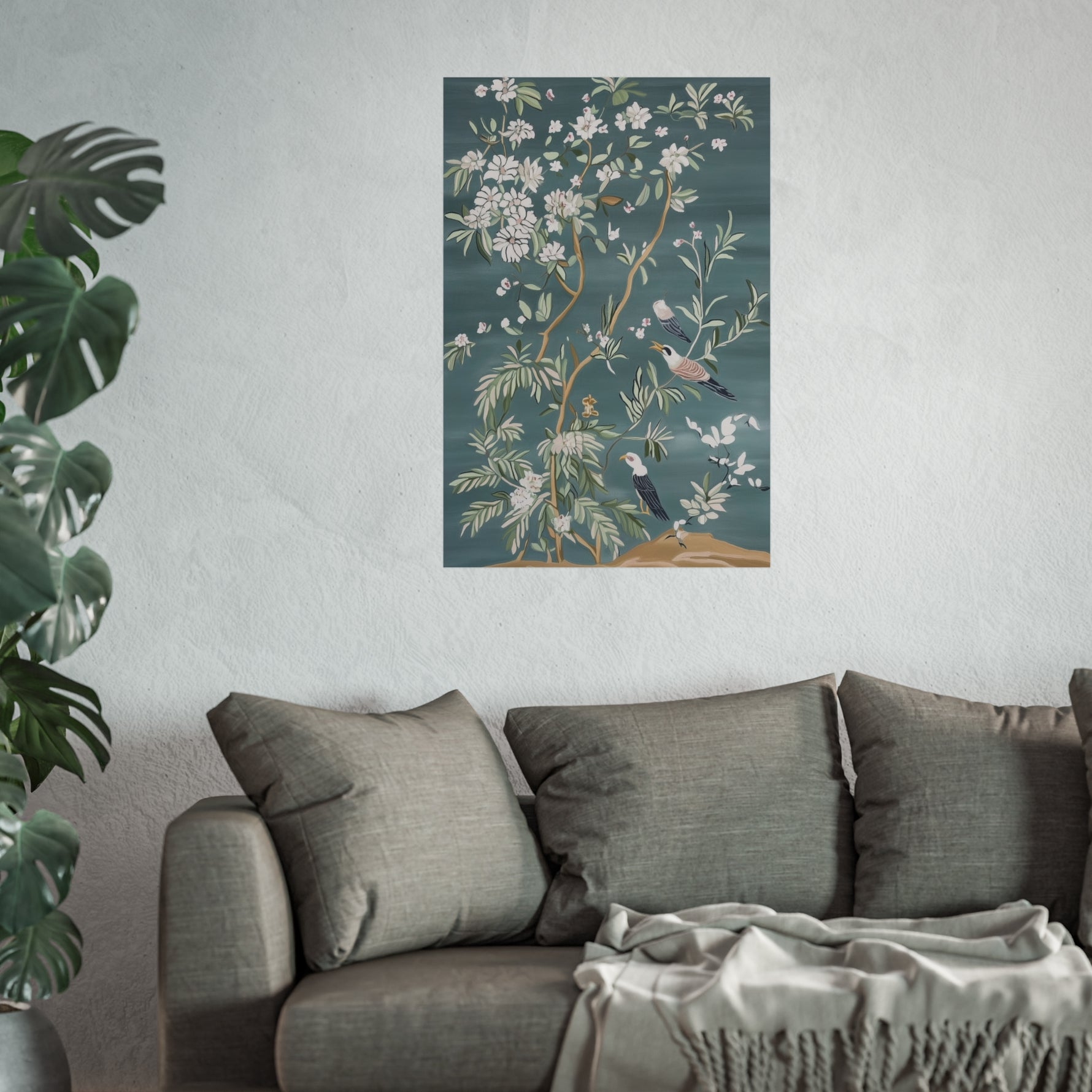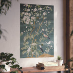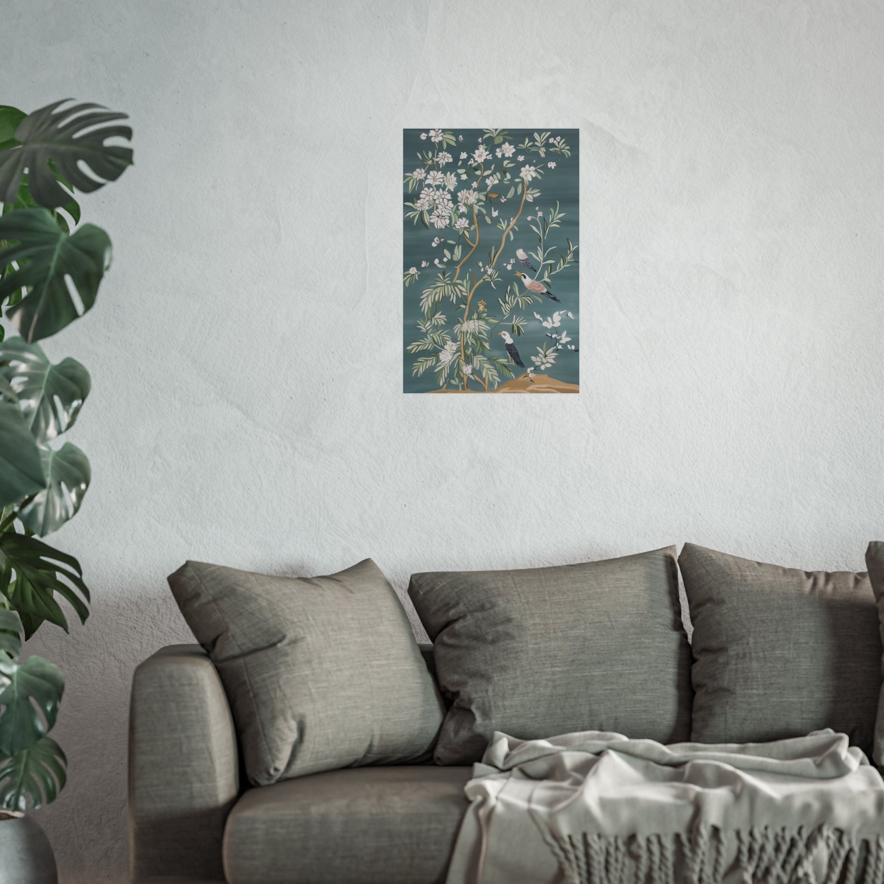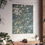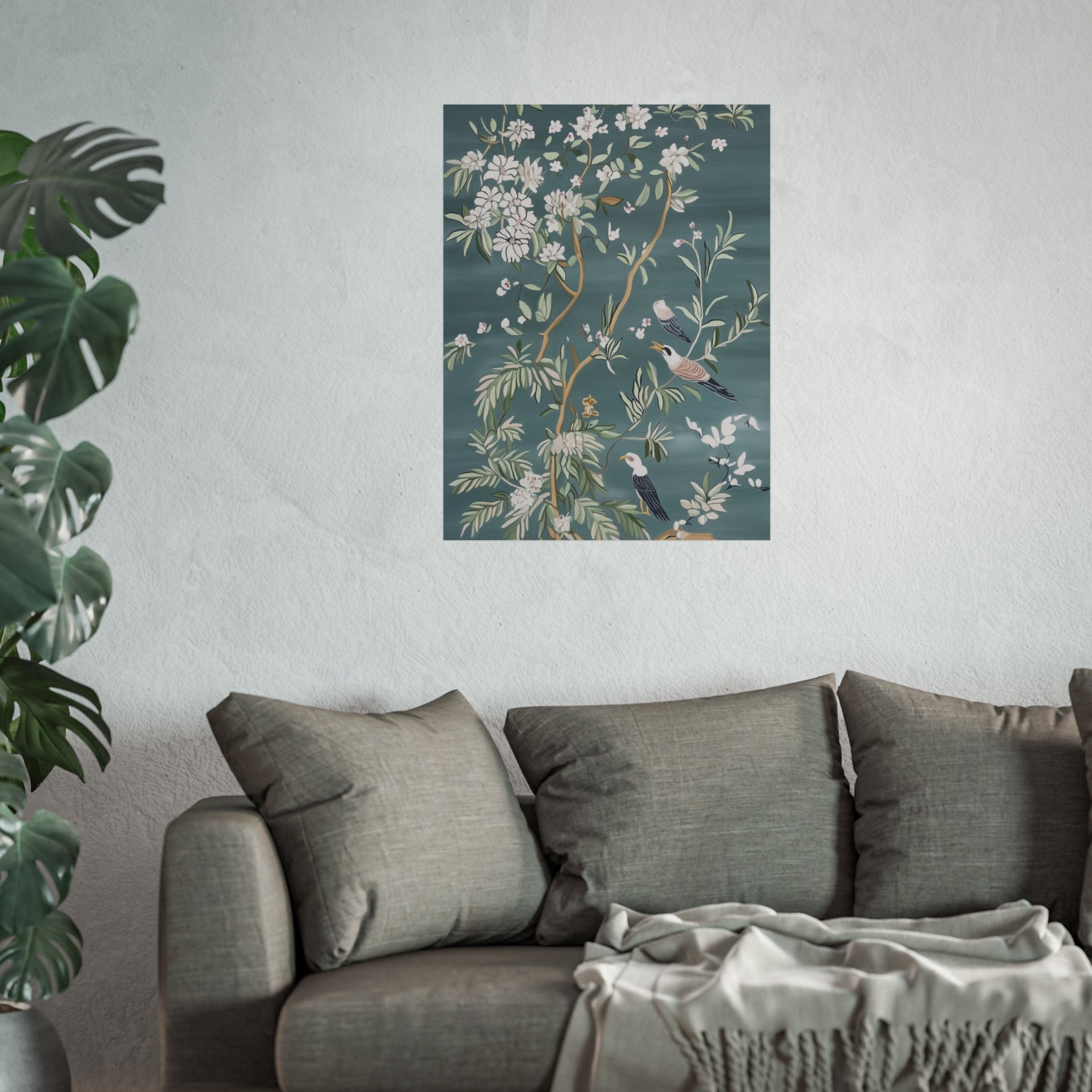 Dark Gray Chinoiserie Birds and Floral Scene Fine Art Poster