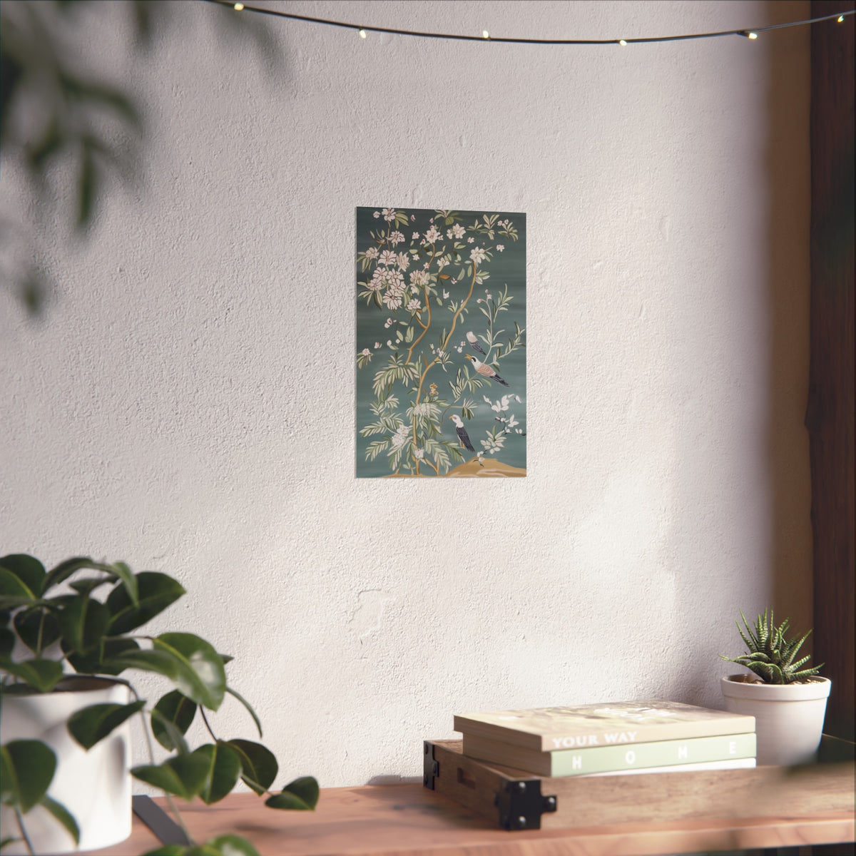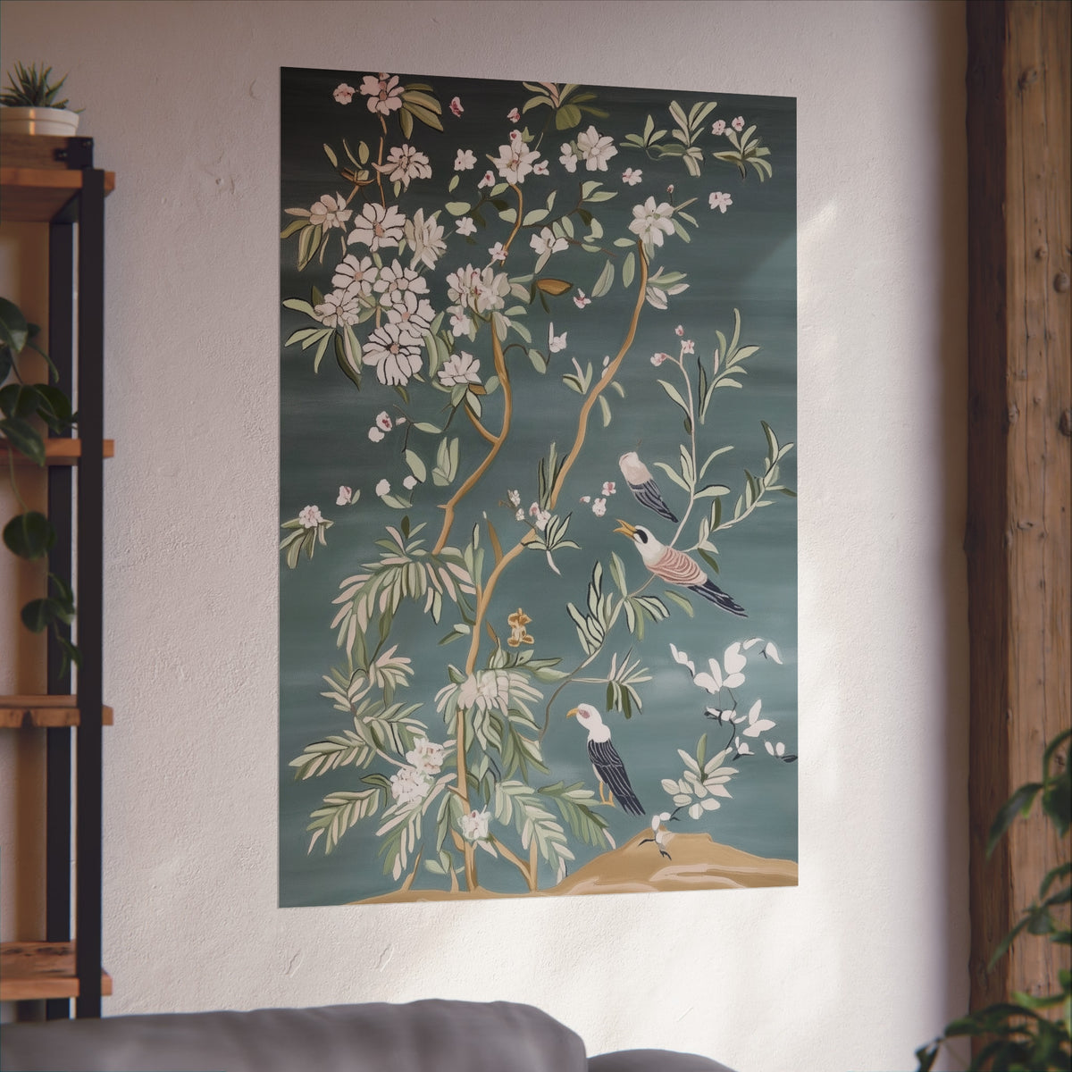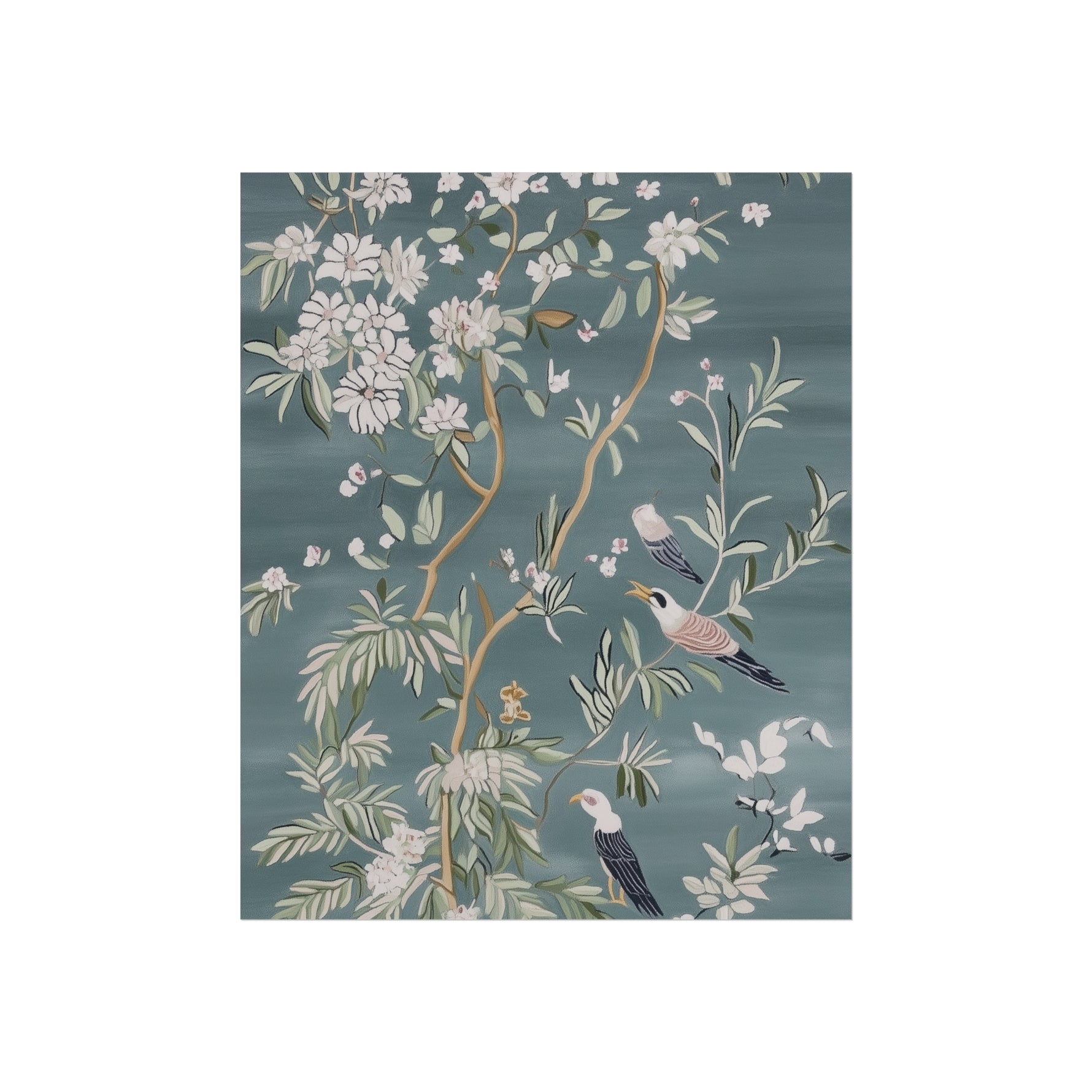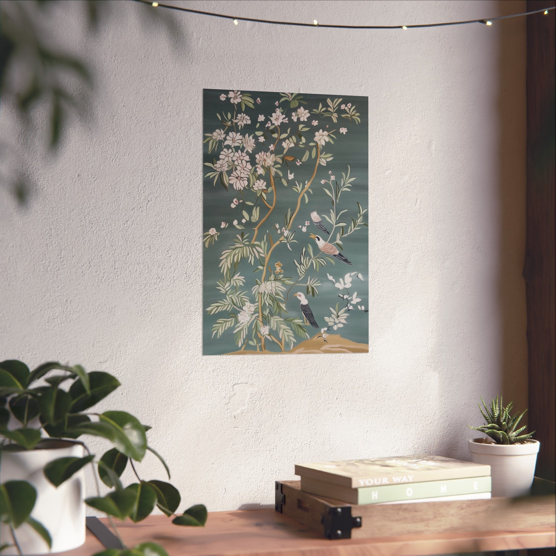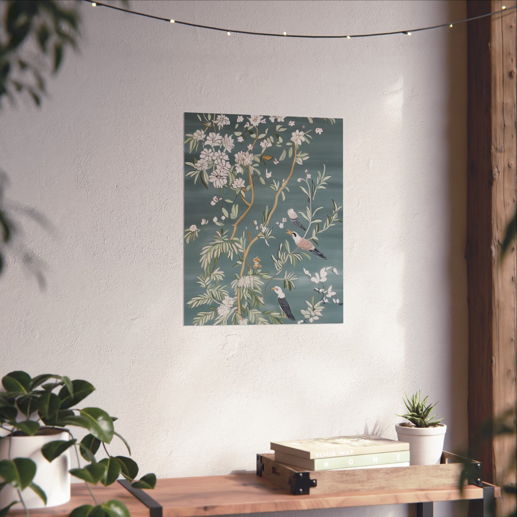 Dark Gray Chinoiserie Birds and Floral Scene Fine Art Poster