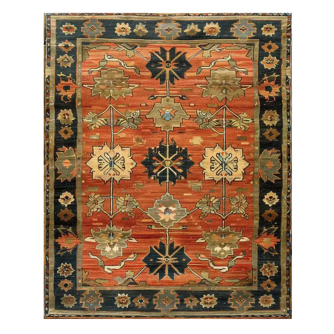 The Desert Bloom Hand Tufted Rug has warm, earthy colors like terracotta, deep blue, and soft gold. They look like land that has been in the sun all day. It has floral designs that are all the same size and shape on a bright background with a strong geometric border. This rug is a beautiful mix of custom and nature, with its intricate vine patterns and stylized flowers. You can use it as a statement piece in any living room to add rustic charm and classic grace.