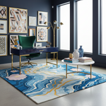 Our ‘Ebb and Bloom’ hand-tufted piece captures the serene flow of water and the delicate bloom of flowers in a harmonious blend of cool blues and vibrant golds. This wool rug’s intricate layering of colors and forms invites you to explore its depths, making it not just a decorative piece, but a focal point of contemplation and elegance. Bring home a work of art that transcends time and style, with a masterpiece that merges the fluidity of nature with the boldness of abstract design..