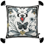 This luxurious cushion cover features an exquisite, symmetrical design of nocturnal insects and botanical elements. The centerpiece is a detailed butterfly with prominent eye spots, flanked by delicate wildflowers and a striking dragonfly with a golden, heart-shaped body. The black-and-white sketch style on a clean white background creates a sophisticated and timeless look.