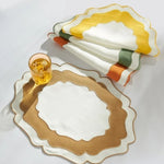 Inspired by the soft, flowing shapes of a desert dune, these luxurious Gold Dune Scalloped Placemats bring a touch of natural elegance to your dining table. The serene golden-brown embroidery creates a striking contrast against the clean white base, outlining a beautiful, fluid scalloped design. These pieces are crafted from 100% cotton, making them both durable and stylish. Pair them with a simple napkin to let the placemat be the star, or mix with other earthy tones to create a cohesive and tranquil tablescape.